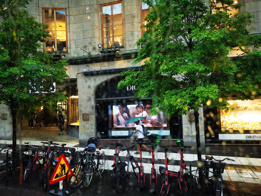 车行进在斯德哥尔摩市区,突然下起了大雨。打破了我们逛皇后大街的计划。看到了斯德哥尔摩音乐厅,是一座通体蓝色外墙的建筑,亦称为蓝色音乐厅,它是每年诺贝尔奖颁发之地,瑞典国王为获奖者授奖。经过塞尔格尔广场,看到了由N多块玻璃组成的大柱。广场四周的国王街,皇后街和斯维亚街是城市的最繁华商业区。我车拍了一张,以表游过了,哈哈~~