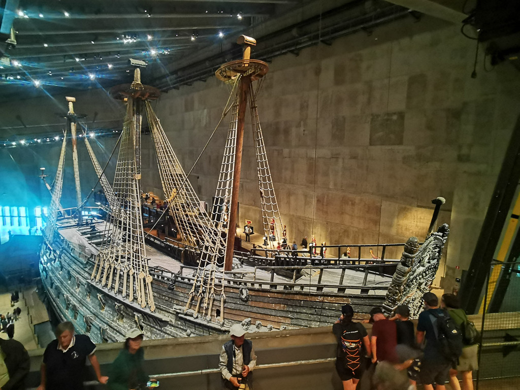 瓦萨号战舰是由古斯塔夫二世(Gustav II Adolf)下令建造的,造价在当时可说是世界之最。1628年8月10日,这艘雕饰华丽、威风凛凛的战舰在驶离斯德哥尔摩港口不远就遇上大风浪翻覆一边,又因船的重量过重而加速沉没。此沉船在水下静卧 300多年之久,于 1961 年被下令打捞,并为此特别修建了博物馆,量身定做啊,呵呵,牛!