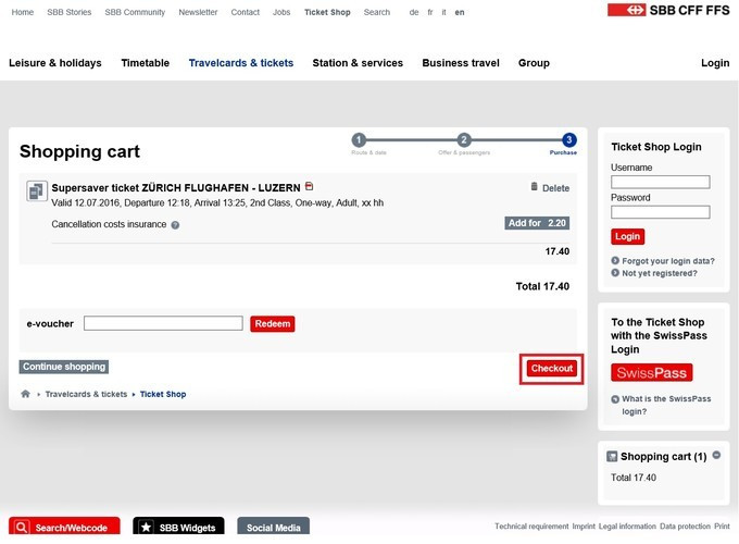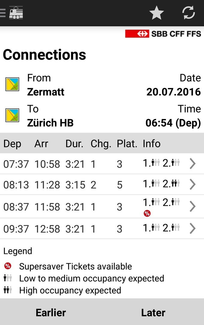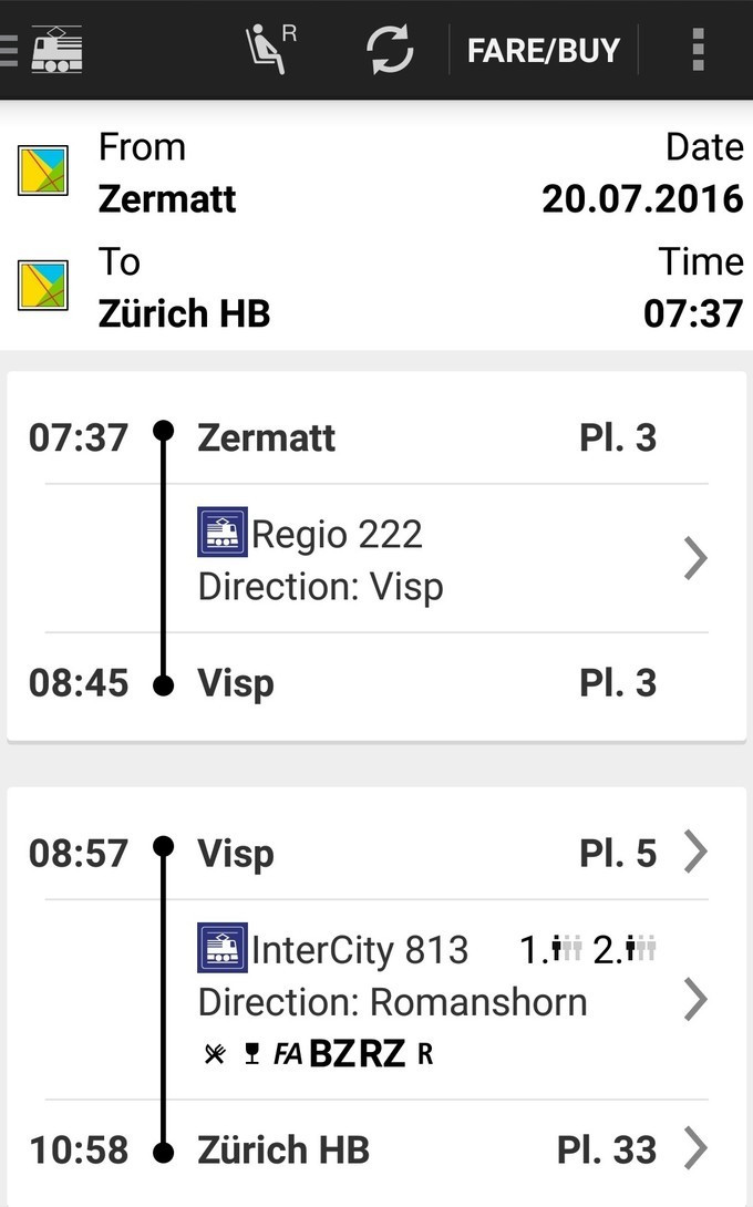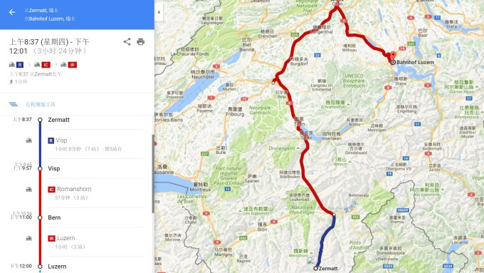 因为在瑞士整整10天,而通票只包含8天,大致估算了每天出行的里程,最后一天从苏黎世火车站到机场只需10分钟,包含在8天里太亏,所以到时候直接在当地购票。第一天从苏黎世到卢塞恩1个小时车程,倒数第二天从采尔马特往苏黎世赶要近四个小时,显然倒数第二天包含在 Swiss Pass的8天有效期内划算,所以决定在瑞士联邦铁路官网上单独预定第一天苏黎世-卢塞恩的单程火车票。