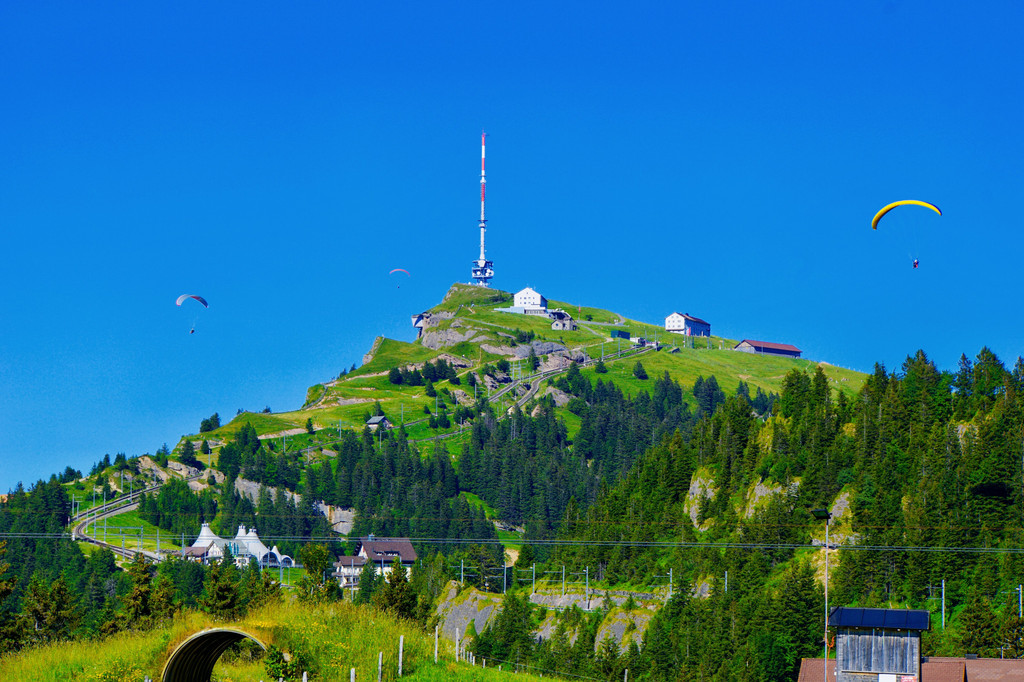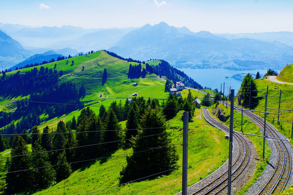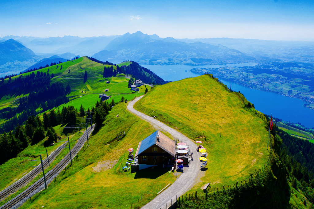 从山顶走下来大概20分钟,就能看到下面白色屋顶的建筑,那儿就是瑞吉•施塔菲尔(Rigi Staffel),这里是观赏卢塞恩的最佳位置,也是拍摄日落的好地方。下山的火车在这儿分开,红色的去往菲茨瑙,蓝色的去往阿尔特-戈尔道。
