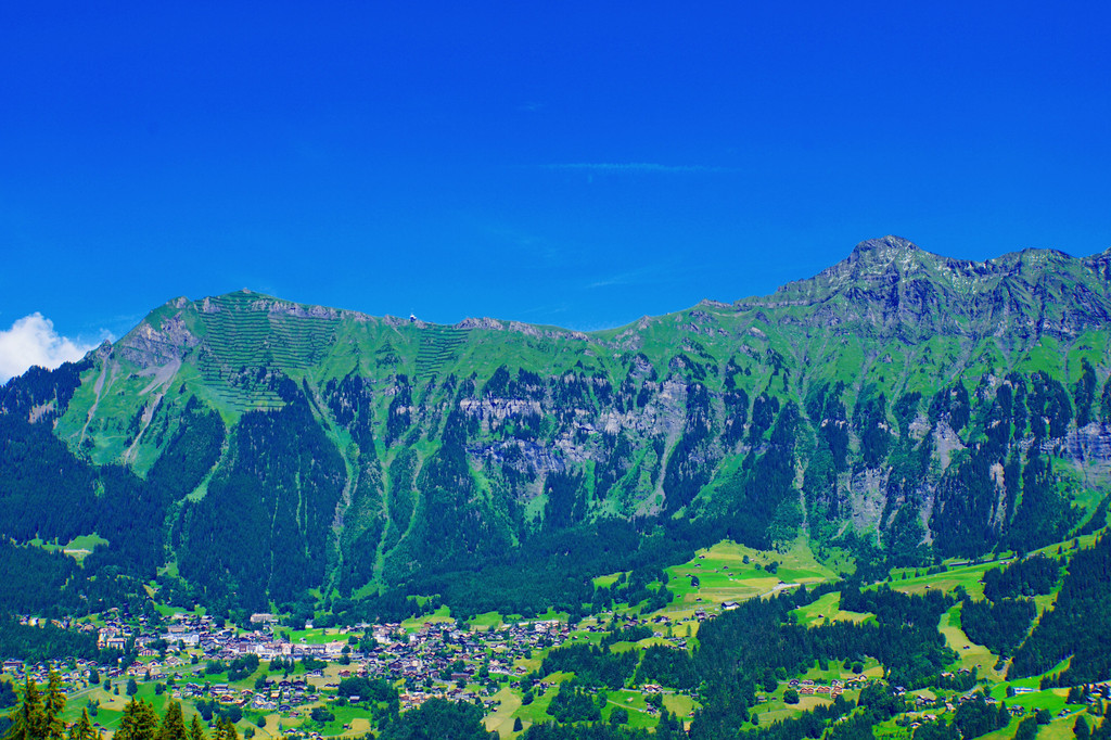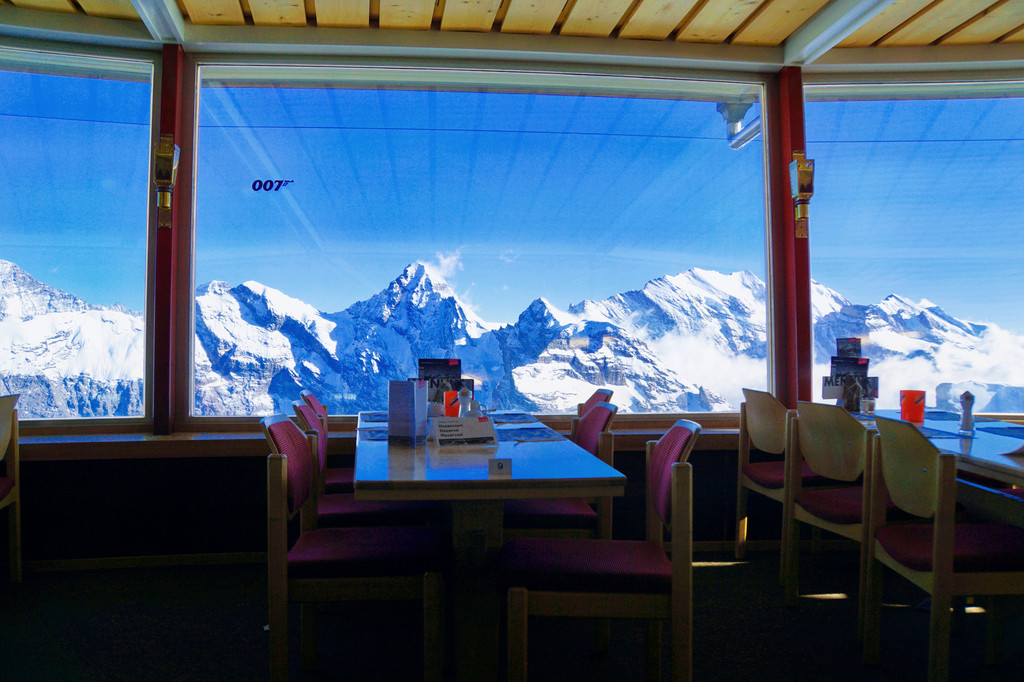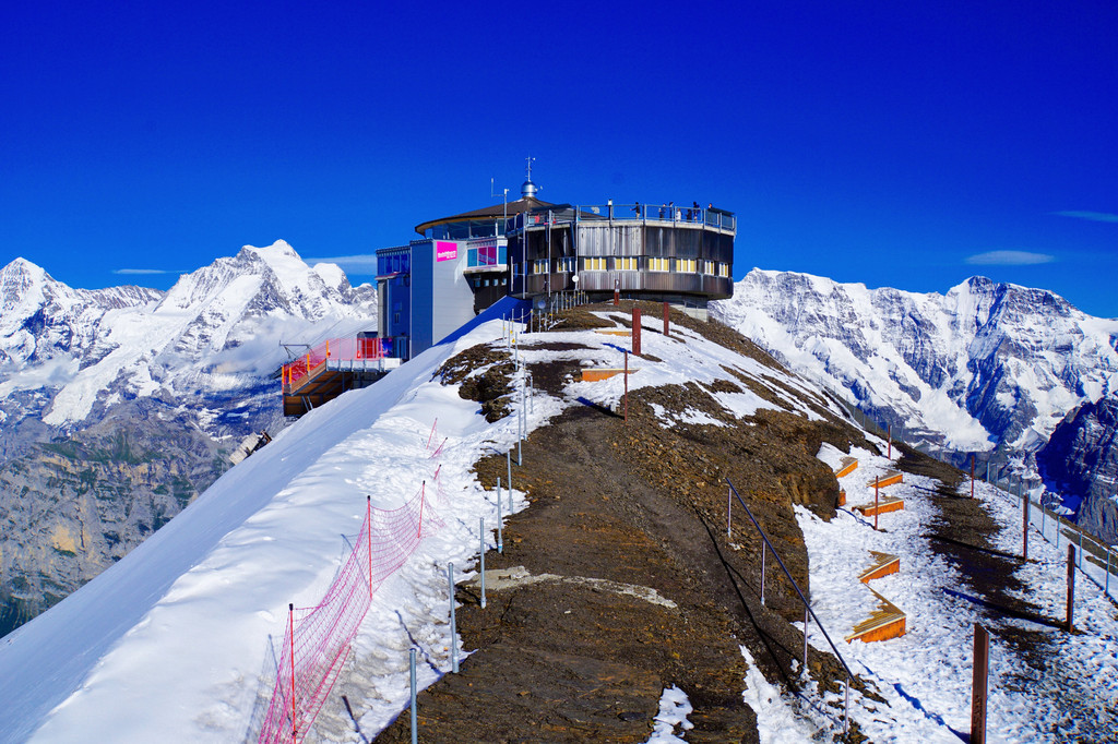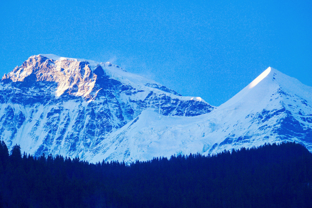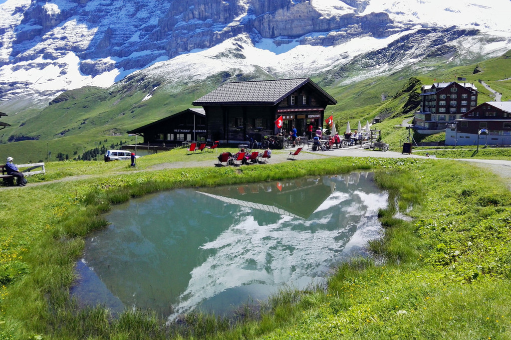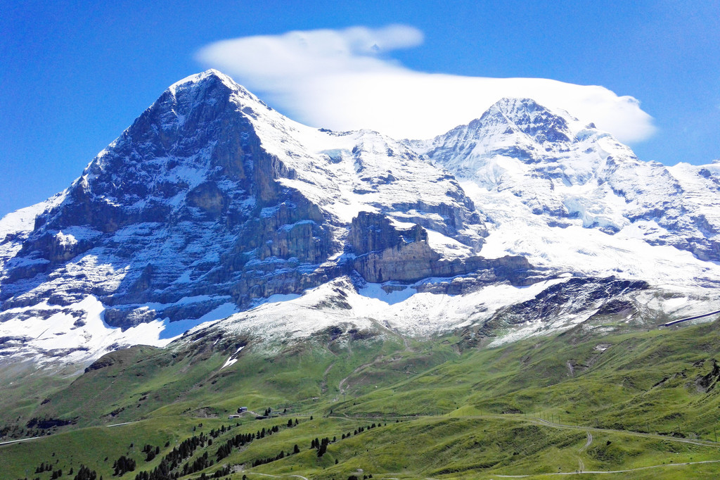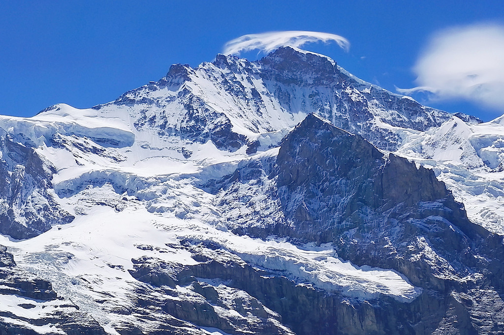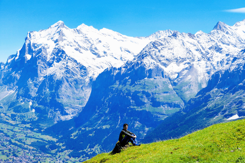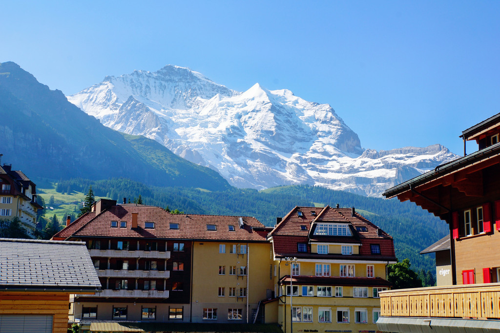 看了指示牌,对照了一下,远处中间缺口的左边那座是艾格峰,右边分别是僧侣和少女峰,感谢我的长焦镜头 。
