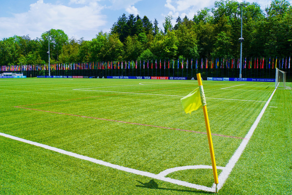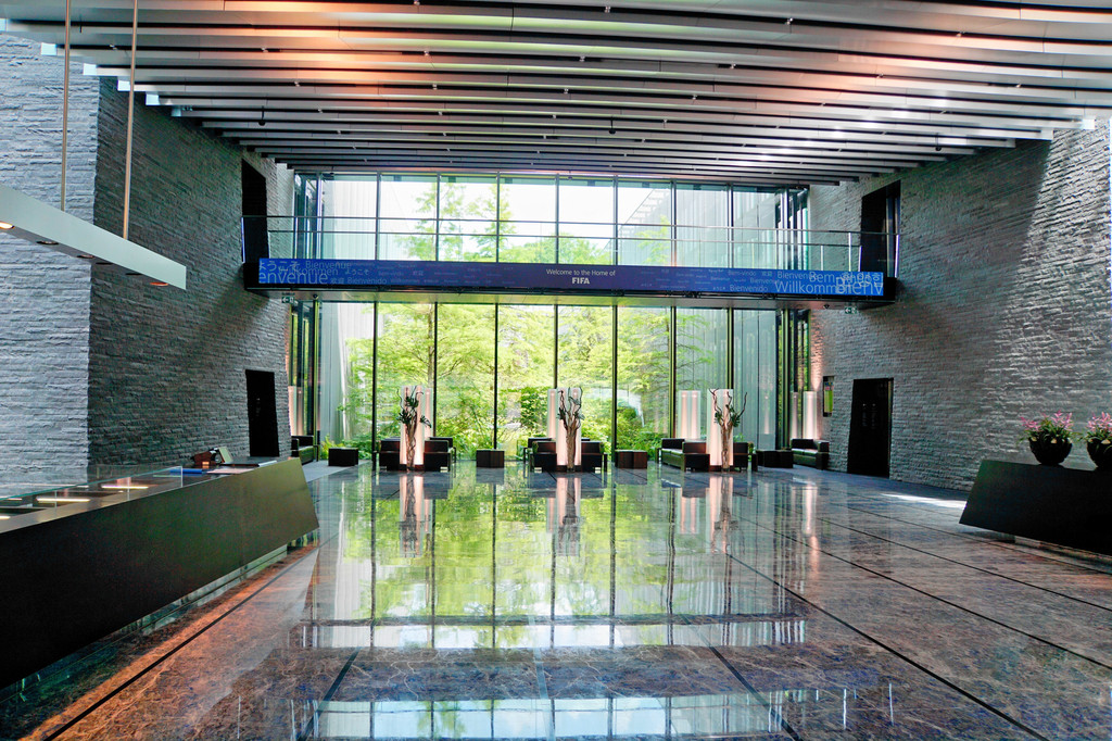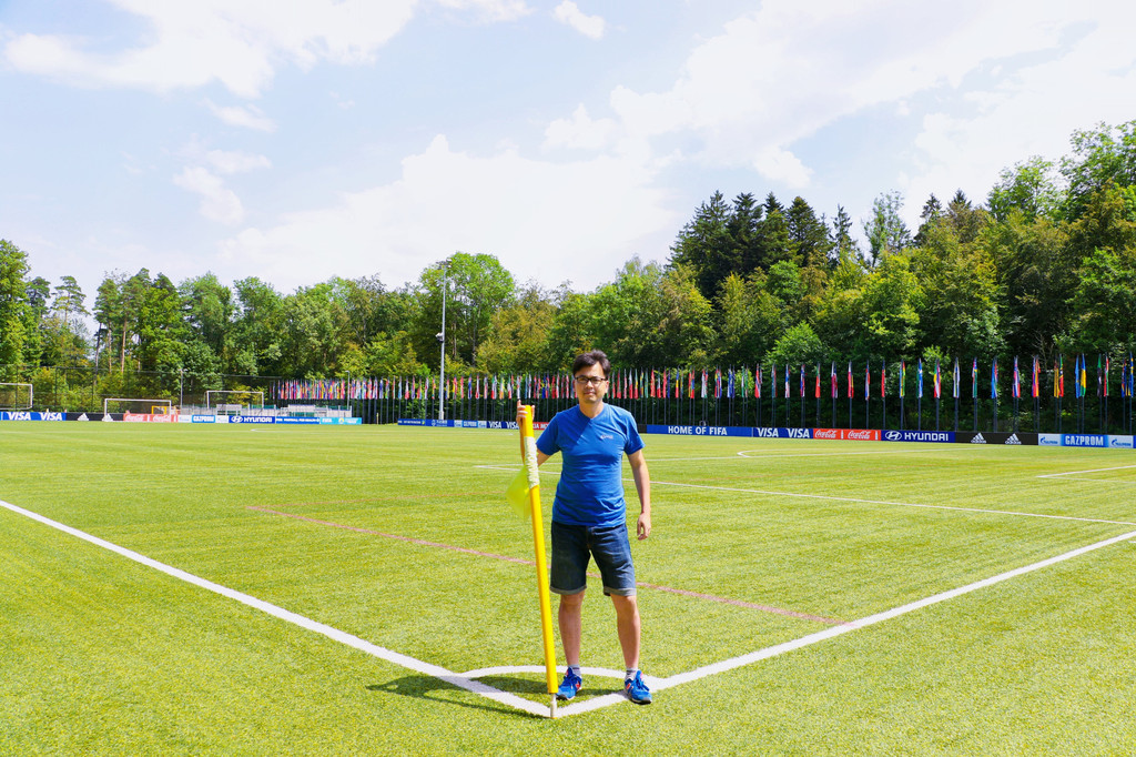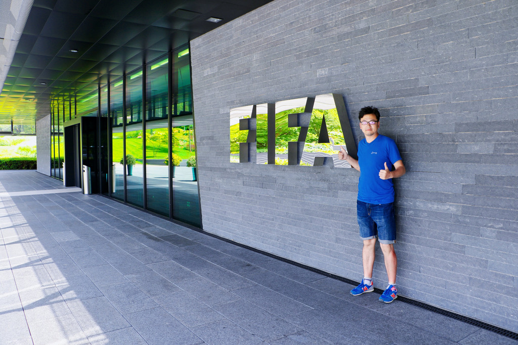 大楼旁边还有块球场,看到绿草坪就热血沸腾,真想上去踢一会儿,以后老了好跟小外孙炫耀:你外公2016年的时候曾经在国际足联总部旁边的草坪上踢过球……