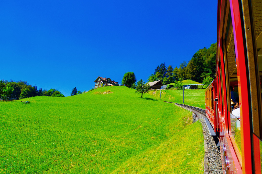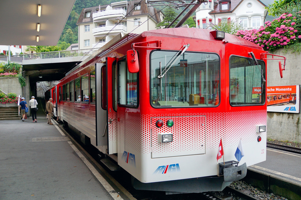 思考间船已到菲茨瑙(Vitznau),熟门熟路,赶紧下船去坐小火车,当然照例是左边靠窗位置。
