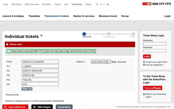特别提醒:瑞士联邦铁路官网只能预定从预定之日起1个月以内的车票,超出日期范围如下图绿框所示会报错。