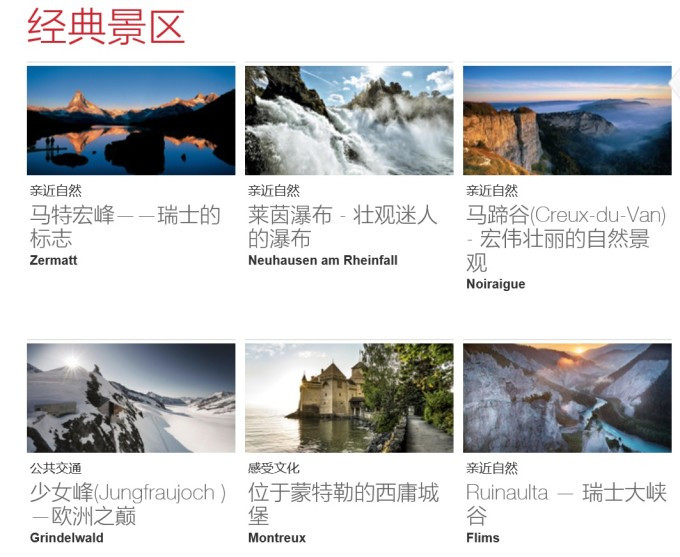 雪山:少女峰地区(Jungfrau)、雪朗峰(Schilthorn)、马特宏峰地区(Matterhorn)、瑞吉山(Rigi)、马蹄谷(Creux du Van)