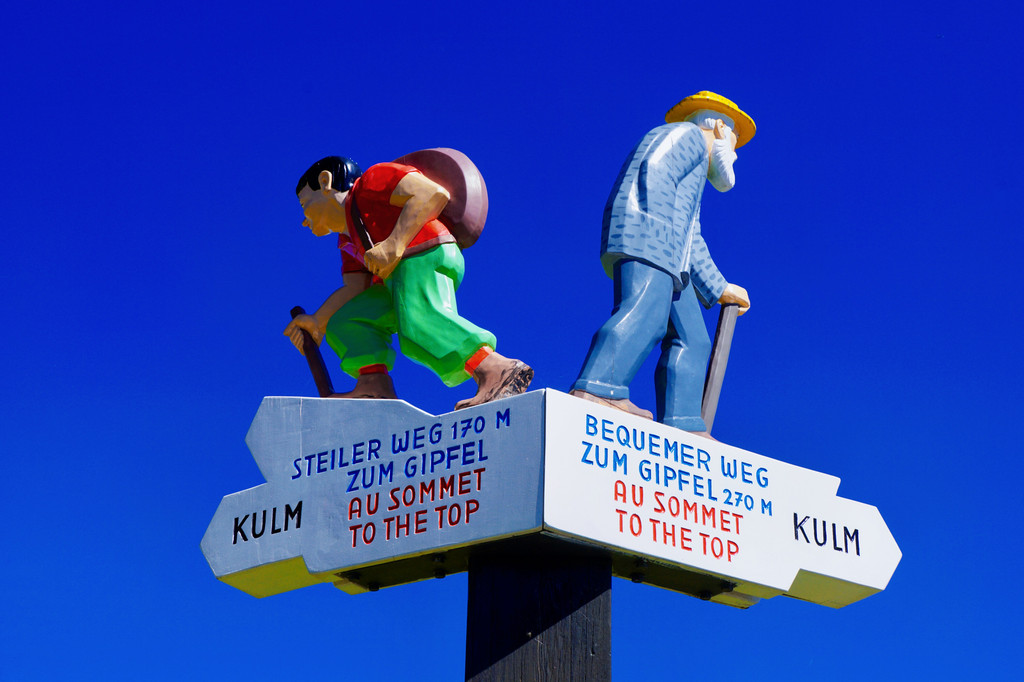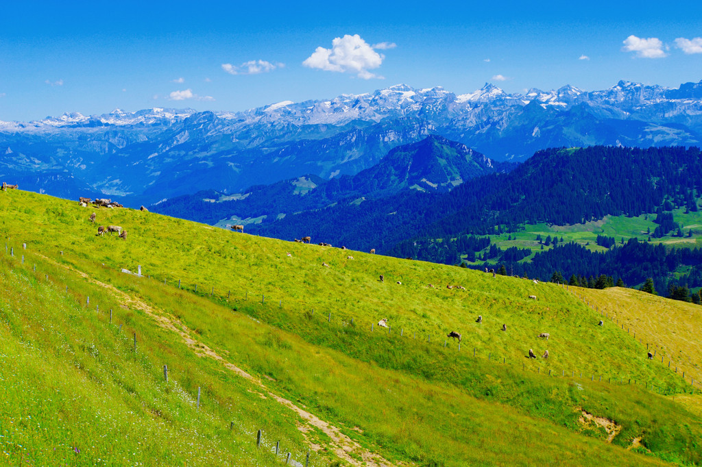 继续往下走,在一个小店前有分叉路,左边一条是近路,15分钟能到瑞吉•卡尔特巴德;右边一条要绕道瑞吉•坎策丽(Rigi Kanzeli),比左边一条多花10分钟才能到瑞吉•卡尔特巴德,但是这10分钟花得绝对值,因为瑞吉•坎策丽有一个180度的全景观景台,是观赏卢塞恩湖的好地方。