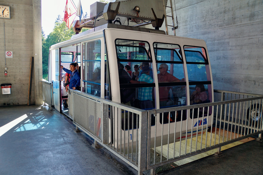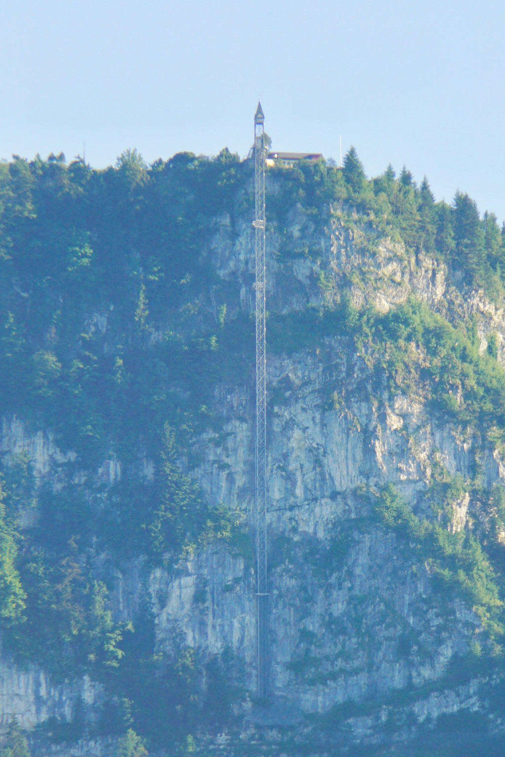 镜头拉近。介绍一下,这部电梯是位于布尔根施托克(Bürgenstock)的Hammetschwand观光电梯,它是欧洲最高的户外电梯(冬季不开放),它可以在一分钟之内将乘客送达152.8米Hammetschwand顶端。站在顶端,可以鸟瞰卢塞恩湖 、瑞吉山、 石丹峰, 皮拉图斯山和布伦尼格山口以及远处的伯尔尼高地群山。如果你感兴趣的话,可以从卢塞恩坐船到Kehrsitten-Bürgenstock下来,换乘通往布尔根施托克的缆车,经过Felsenweg山石路就能到达电梯的下面。