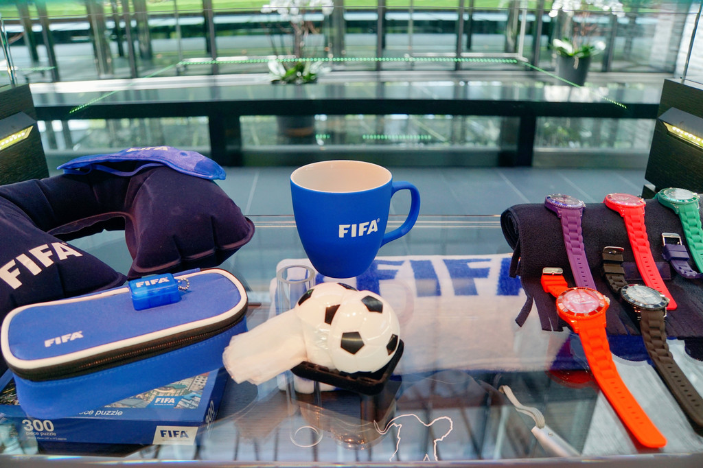 另一侧陈列着可供出售的纪念品,由此可以看出,FIFA真是一个以营利为目的的国际组织。