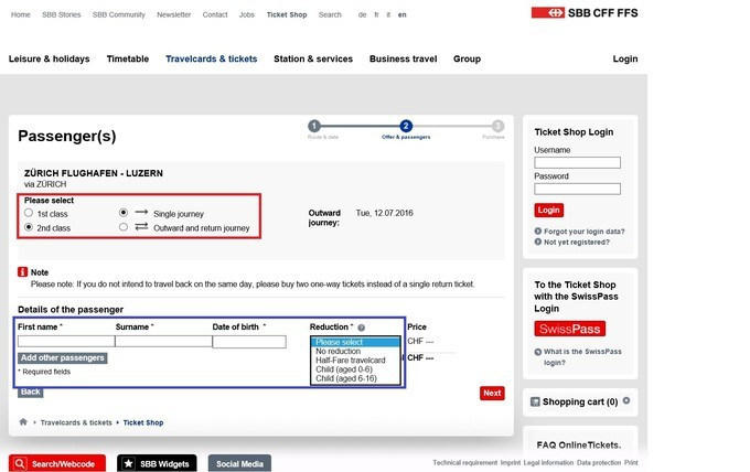 第二步:选择座位等级、单程还是往返。然后填写乘客明细信息,需要填写名、姓、出生日期和选择有无减价优惠。所有乘客信息都填完后,点击Next。
