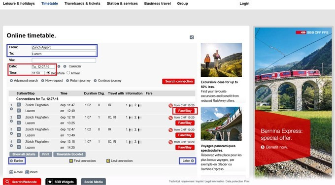 第一步:选择起始站、出行日期和时刻,点击Search connection后,会出现该时刻开始最近的4个车次,根据需要选择相应车次点击Fare/Buy。如果想选前面或者后面的车次可以点击Earlier或者Later再次查询。