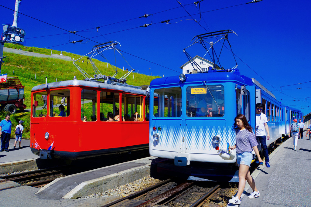 红色火车是往来菲茨瑙和山顶的,蓝色的是往来阿尔特-戈尔道(Arth-Goldau)和山顶的。特别提醒:阿尔特-戈尔道有直接回苏黎世的火车,不用再绕道卢塞恩。