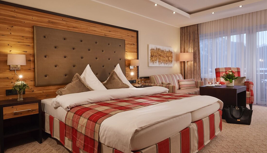 酒店共有55间温馨舒适的客房,每一间都精心设计,配有传统的樱桃木或桃花心木家具,散发出浓厚的阿尔卑斯风情。每个房间都配备现代化的设施,确保您的居住舒适无忧。大部分客房设有南向阳台,您可以在阳台上俯瞰花园美景,并欣赏到楚格峰(Zugspitze)和周围群山的壮丽景色。