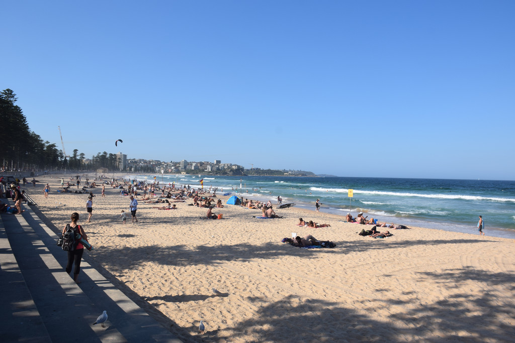 在往返的船上可以各个角度观赏到遥遥相对的悉尼歌剧院和海港大桥,逛完动物园回到码头,换上去曼丽海滩(Manly Beach)的船。到了曼丽海滩的码头,以为码头旁边那个小海滩就是曼丽海滩,心里想着这个小海滩怎么会出名,真奇怪,玩了一小会才反应过来曼丽海滩离码头有一段距离。当时逛完动物园已经累得不行,强撑着走到海滩才发现曼丽海滩出名还是有道理的。