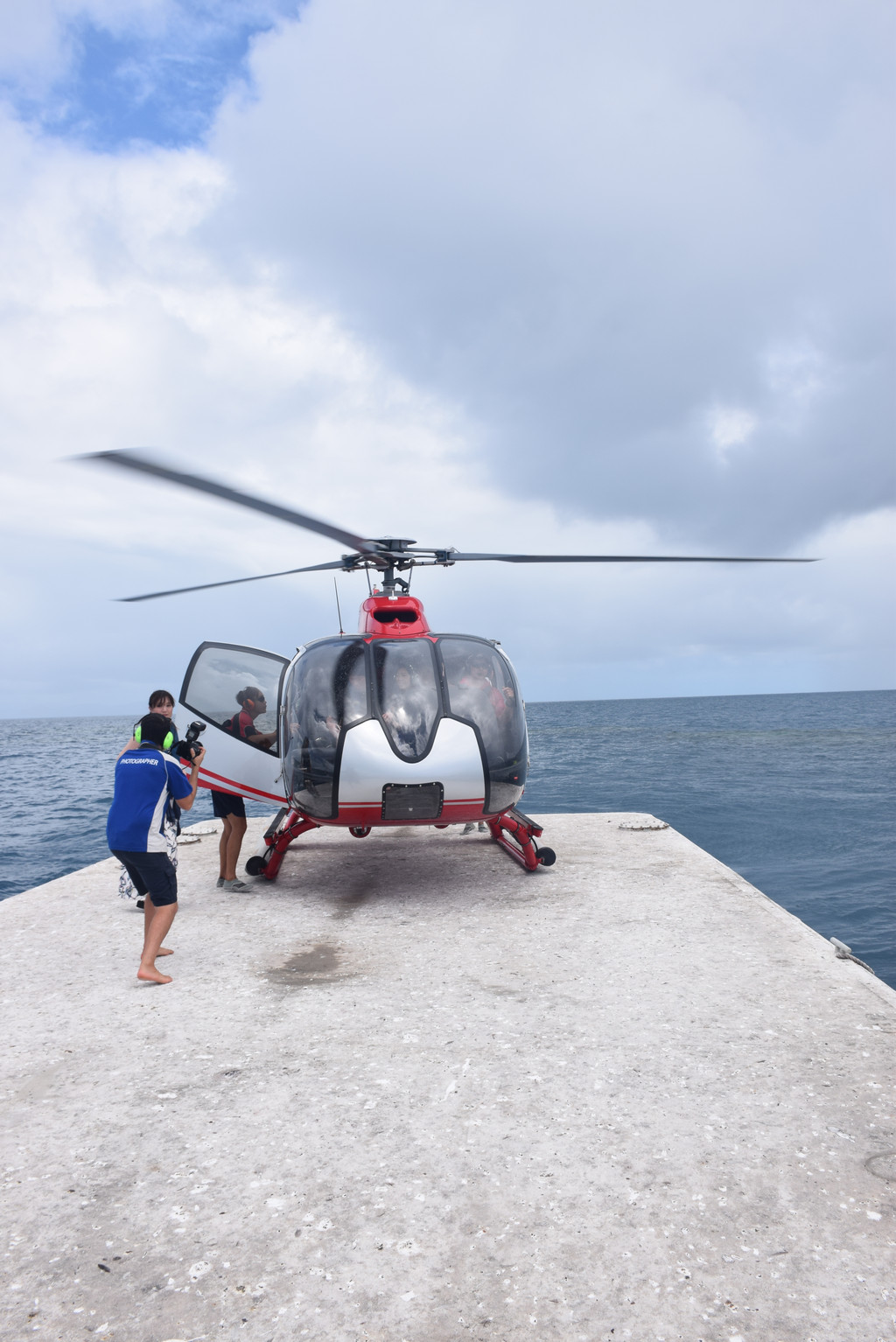 直升机绕着大堡礁,海上平台飞了一圈,又重新停回直升机平台上。