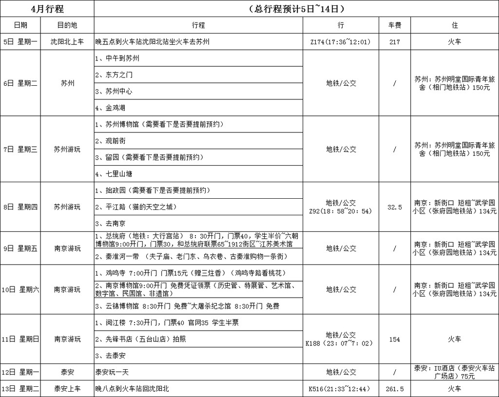 4)行,提前一周左右定好所有行程衔接的火车票 (沈阳→苏州、苏州→南京、南京→泰安、泰安→沈阳 车票共计 217+32.5+154+141.5=545元)