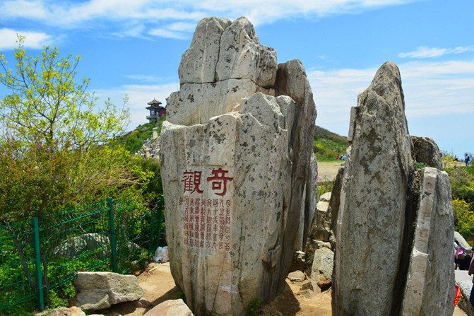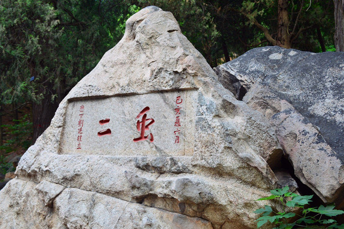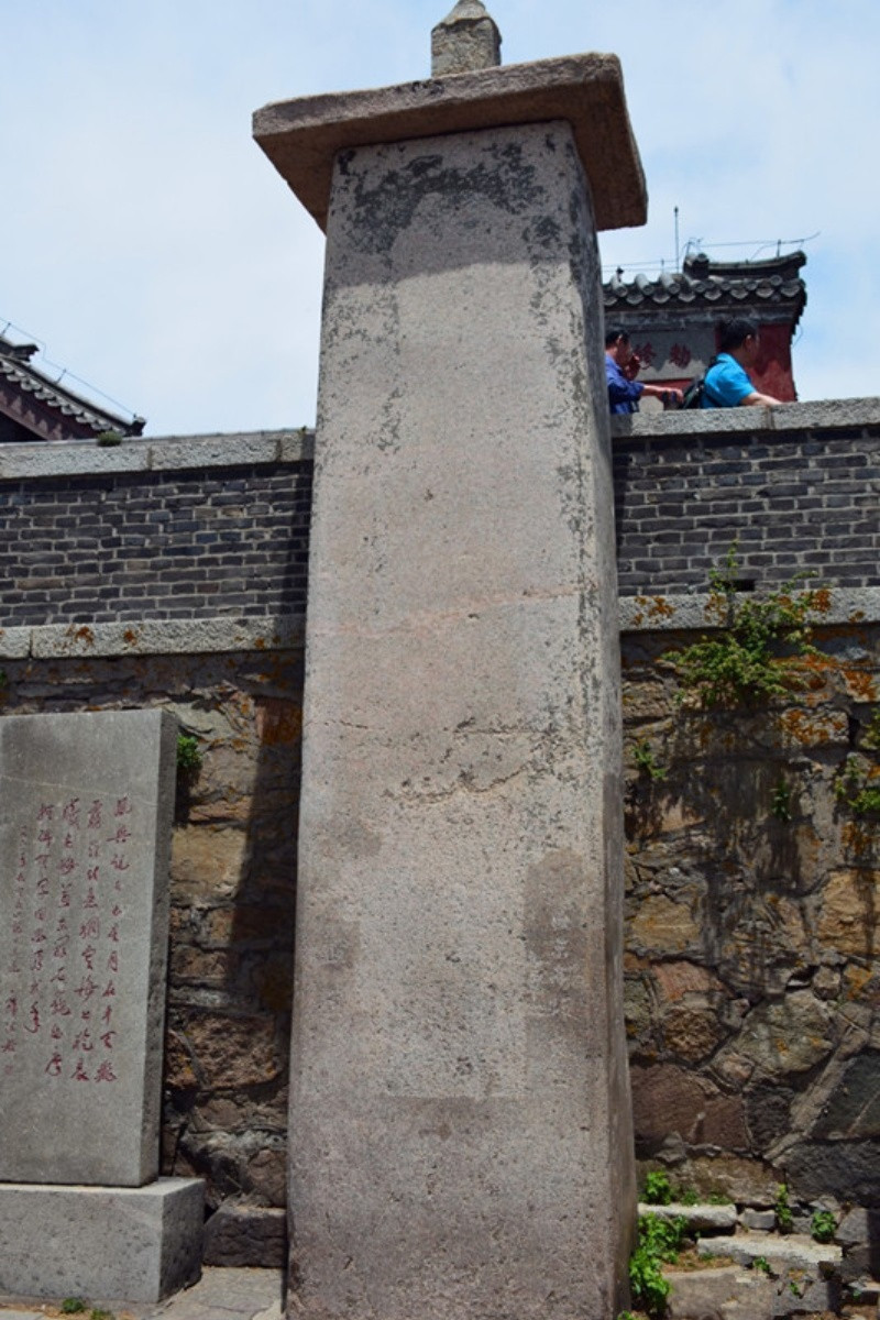 无字碑。年代无考,为何无字也未有考,是碑是碣无考。位于泰山极顶玉皇庙山门前八米处,因通体无字,故俗称无字碑。由石柱、顶盖石和顶柱石三部分组成。石柱高499.5厘米,明、清两代有不少人认为泰山无字碑是秦始皇所立,立碑之意在于焚书。他们在赋诗吟咏时表述了上述看法,如明代王在晋称:“东海长流石未枯,山灵爱宝隐元符;纵教烈焰焚经史,致使秦碑字也无。”清代乾隆皇帝更断言:“本意欲焚书,立碑故无字;虽云以身先,大是不经事。”