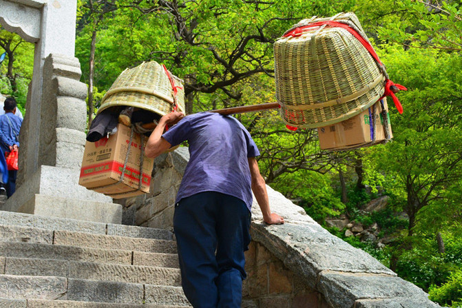 再不要抱怨景点山上物价奇高,你出去背一个小包,都累的够呛,看看这位大叔,现代版“挑山工”。这使我想起冯老先生的文章《挑山工》,敬佩之情油然而生!