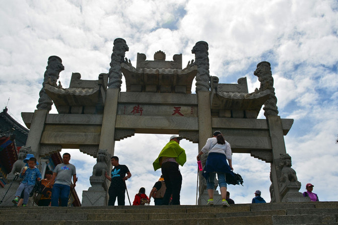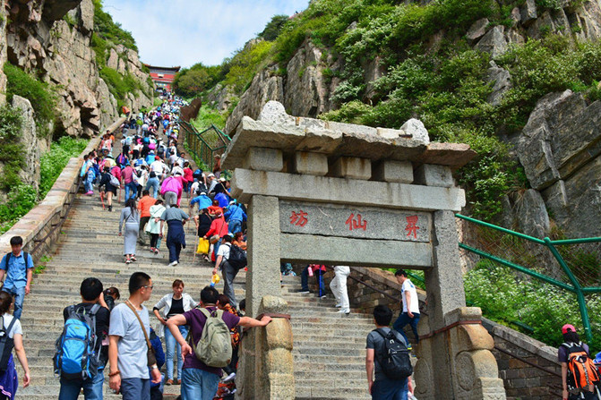 升仙坊。总算熬到“升仙坊”了,南天门看似近在咫尺,可就是走不到,台阶越来越陡了,大概有70度的样子吧。“升仙坊”位于南天门之下,全石双柱单门式。在南天门之下,不紧不慢十八盘与紧十八盘交接处。此处向上,悬崖峭壁,山势陡峭,由此登山,越登越陡,愈攀愈险。上临岱顶天庭,咫尺仙境,似有飘然升仙之意境,故名"升仙坊"。游人至此,驻足小憩,浮想联翩。回视山下,常有腾身云霄之感;举首仰望,南天门近在咫尺,奋力攀登,升仙在望。