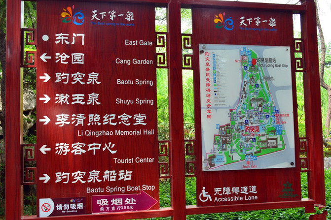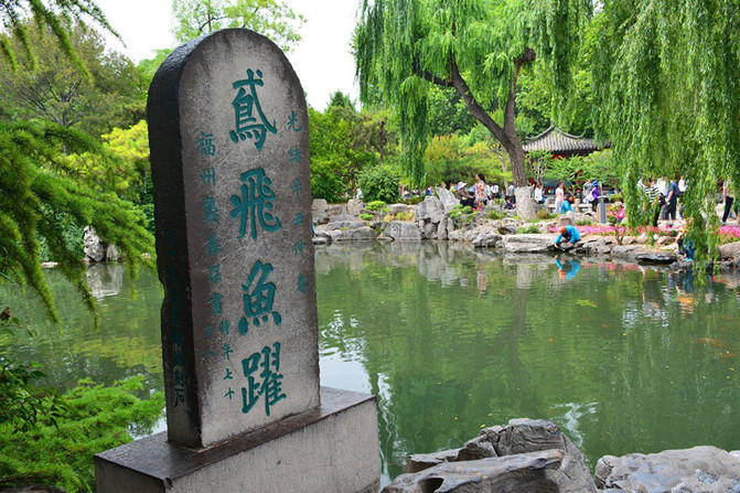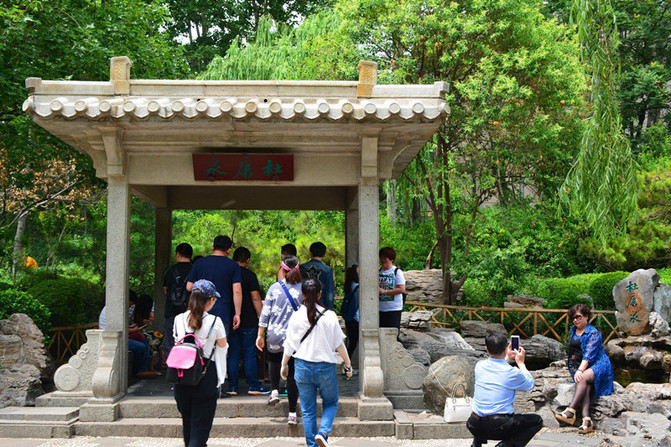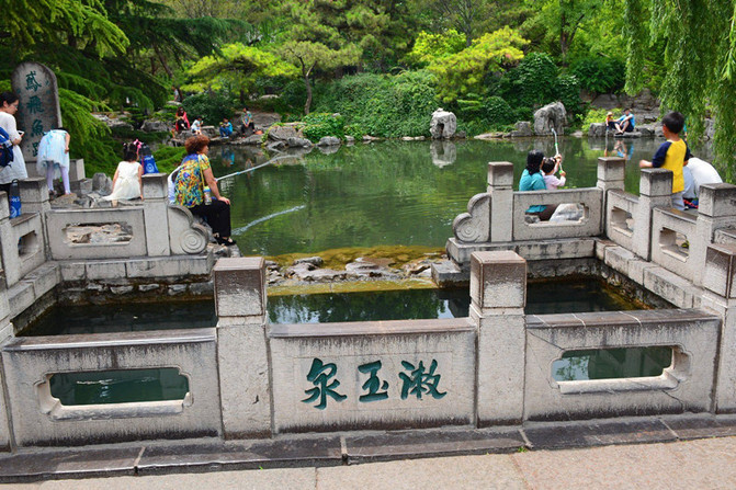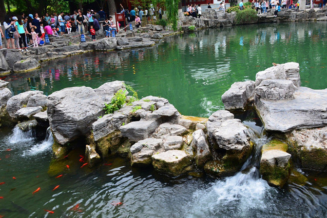 天下第一泉----趵突泉。怀着无比激动的心情转了大半个园子,心想还是最后看趵突泉吧,其实在网上大概了解到由于干旱少雨,趵突泉近年已失去“趵突”雄姿,可真没想到眼前的趵突泉是波澜不惊,连点儿水花花都没看到,偶尔有个气泡还是池里的鱼儿在撒欢,公园游人如织,但是泉边人流稀少,大概和我一样太失望了吧。
