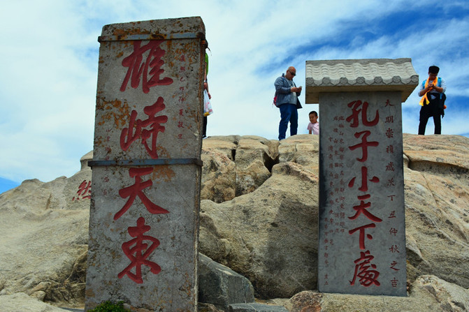 "孔子小天下处"石碑位于岱顶玉皇阁,相传为孔子当年俯瞰天下之地。这其实是明朝山东御史颜继祖根据孟子的名言"孔子登泰山而小天下"所刻之石,现已为泰山上诸多与孔子有关的胜迹之一。
