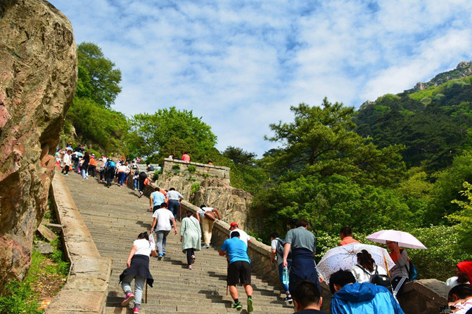 开山遥望“南天门”,好似近在咫尺,可是最艰难之道,后面娓娓道来。开山---“南天门”之间为登泰山最艰险的一段,名为泰山“十八盘”,共有石阶1630余级,为泰山的主要标志之一。此处两山崖壁如削,陡峭的盘路镶嵌其中,远远望去,恰似天门云梯。泰山之雄伟,尽在十八盘,泰山之壮美,尽在攀登中!自开山---龙门为“慢十八”,龙门---升仙坊为“不紧不慢又十八”,升仙坊----南天门为“紧十八”。