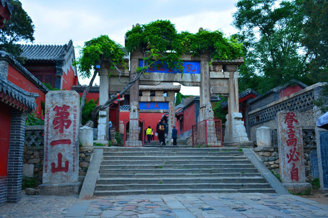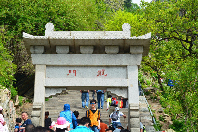 “一天门”坊,明代建,参政龙光题额,清康熙五十六年(1717年)巡抚李树德重建,两侧有明代人题“天下奇观”及“盘路起工处”大字碑。中有孔子登临处坊,明嘉靖三十九年(1560年)巡抚山东都察院右副都御史朱衡等建,嘉靖状元罗洪先题额并联:“秦王独步传千古,圣主遥临庆万年。“登高必自”语出《中庸》“登高必自卑、行远必自迩”,意思是登高一定从低的地方开始,远行一定从近的地方起步。从红门起到岱顶大约有6600多个台阶需要“必自”攀登。