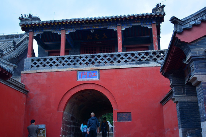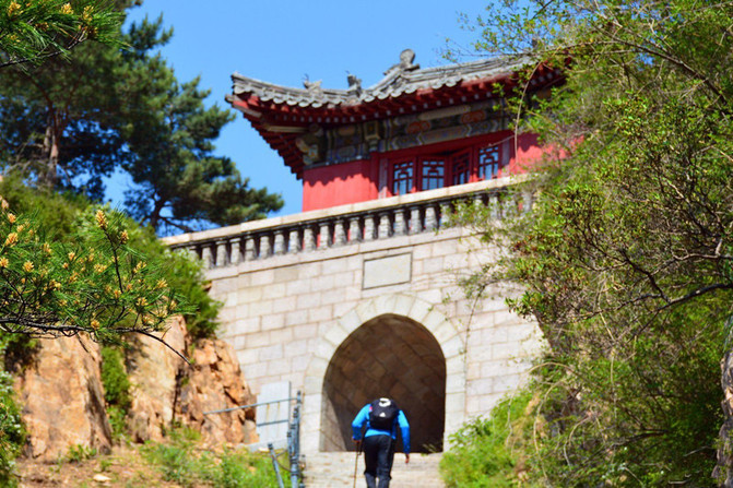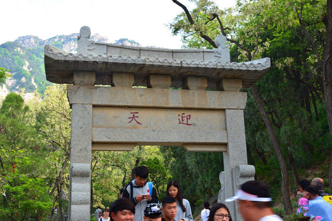 明明是下山,可是有一道门突兀其上,还要登不少台阶,此即“山呼门”是耶,又称望天门,此处两山夹道,为秦御道天然隘口。相传秦始皇登封泰山,文武大臣在此三呼万岁,俗称“三呼门”。