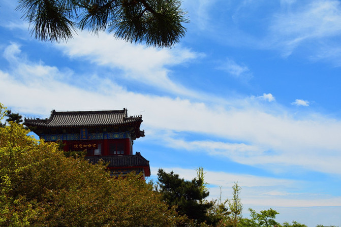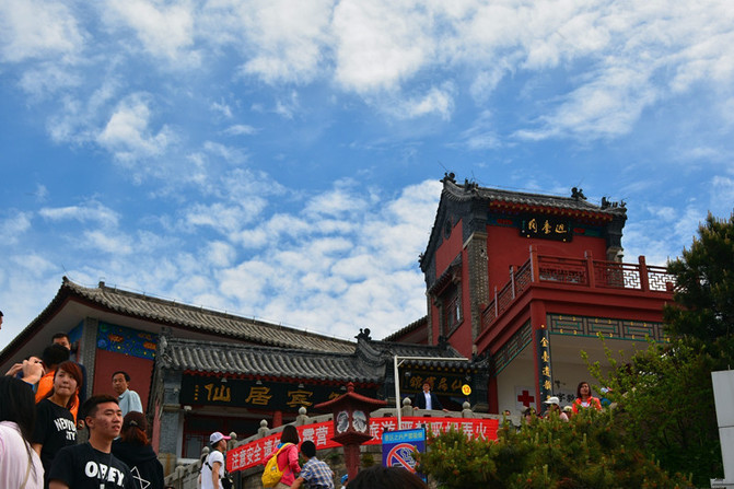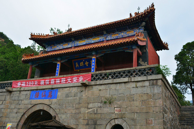 万仙楼。万历皇帝为纪念其母李太后眼疾痊愈,感念泰山圣母有功而敕建的,青山绿水之间,矗立着这座门楼式建筑,雕梁画栋,庄严雄伟,白云蓝天映衬着黄色的琉璃瓦,一派皇家风范。因泰山是华北地区的两大神山之一,神仙众多,民间的最高神玉皇大帝高居泰山极顶,其麾下众神遍布泰山的角角落落,有名有姓的神仙在泰山有112位,因此泰安府古称神州,民谚:济南府的官多,泰安州的神全,即是指此。山不在高,有仙则名。因此楼上有"景会群真"的匾额,泰山是道教名山,称仙为真。传为泰山群仙聚会、议事讲经的地方。