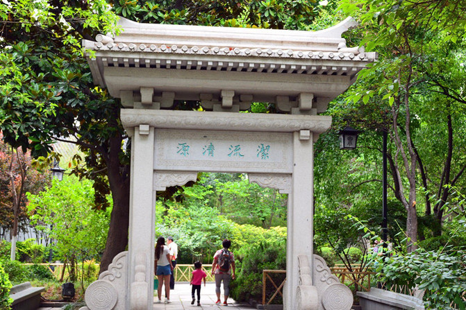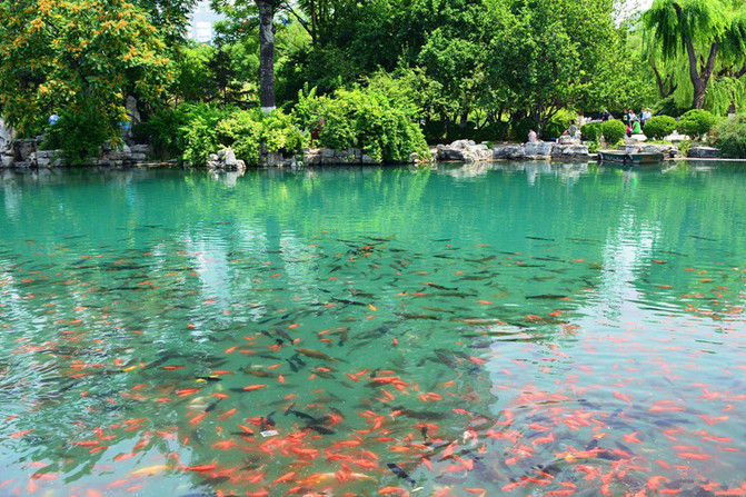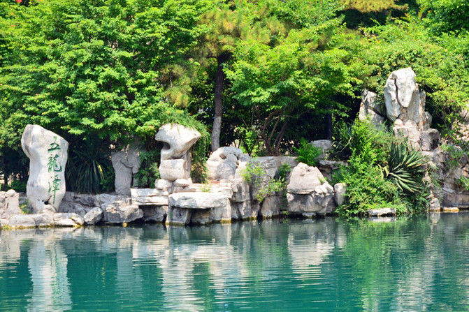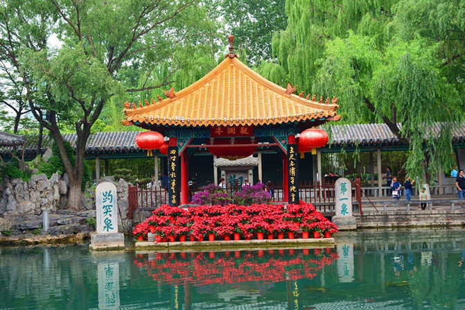 出了趵突泉北门,向北过一条街,就是五龙潭了。五龙潭也叫乌龙潭、龙居泉,是三大泉群的主要泉眼之一。据《水经注》记载,北魏以前就有这片水,称净池,是大明湖的一隅。相传,五龙潭昔日潭深莫测,每遇大旱,祷雨则应,故元代有好事者在潭边建庙,内塑五方龙神,自此便改称五龙潭。五龙潭公园内,散布着形态各异的26处古名泉,构成济南四大泉群的五龙潭泉群。环绕诸多泉池,形成了庞大的五龙潭泉系并成为济南四大著名泉群中水质最好的泉群。此潭,景色极佳,碧波荡漾,澄澈如镜,水木明瑟,锦鱼戏游。