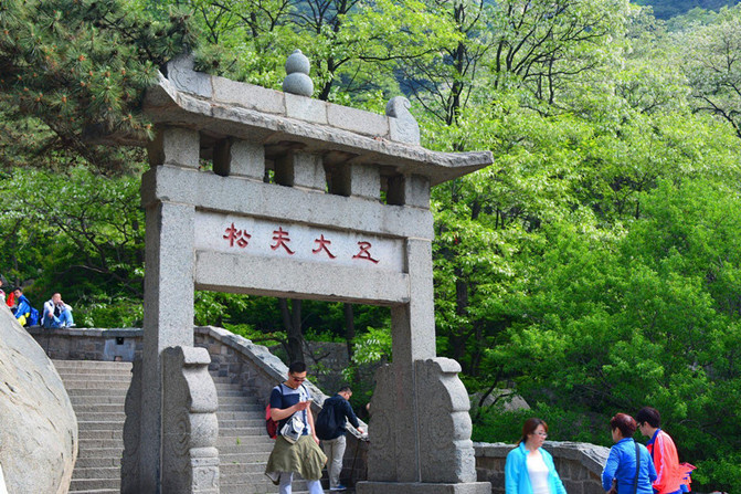 五大夫松。云步桥北侧的五松亭旁,据《史记》载,五大夫松是在秦始皇登封泰山时,中途遇雨,避于大树之下,因树护驾有功,遂封该树为“五大夫”爵位,后被雷雨所毁。 清雍正年间,钦差丁皂奉诏重修泰山时补植五株,今存两株,拳曲古拙,苍劲葱郁,被誉为“秦松挺秀”,现已列为泰安八景之一。