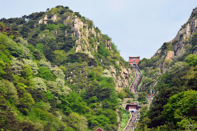 中天门是泰山登山东、西两路的交汇点。此处为登顶半程,上下必经之地,海拔847米,又名三天门,为盘山公路终点。从泰山火车站、天外村、红门等地乘旅游车可直达中天门,再从这里乘索道直上南天门,仅需7分钟。中天门峻岭阔谷,楼阁簇拥。东有中溪山突兀俏丽,可观日出,望晚霞;西有凤凰岭蜿蜓伸展,可远眺傲徕雄姿,俯视城廓新貌。伫立坊下,北瞻巍巍岱峰,众山拱立,林茂泉飞,缆车凌空,天然成画。中天门岭峻谷幽景色壮美,游人至此已升“中天”,无不心旷神怡。此处上山游客大增,原来是从中天门索道上了的。