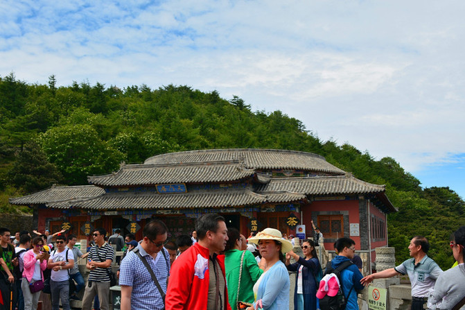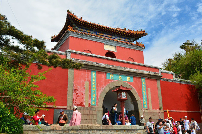 近了,更近了,终于上到了南天门。攀到了泰山十八盘的尽头。南天门又名三天门,是登山盘道顶端,海拔1460米,古称“天门关”。元中统五年,由布山道士张志纯创建,明清多次重修,建国后又翻修两次,现在建筑保持了清代的风格,坐落于飞龙岩与翔凤岭之间的低坳处,双峰夹峙,仿佛天门自开。由下仰视,犹如天上宫阙,是登泰山顶的门户。
