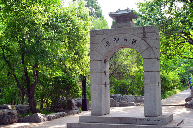 北天门。自丈人峰顺坡北下,至山坳处有石坊,原额"元武",清末圮。1984年重立,双柱单门石坊,额书"北天门"。是岱顶通往后石坞的必经之路。坊北是摩云岭,自坊前顺坡东下至勺形谷底是"乱石沟",过沟是独足盘,再前行可至后石坞诸景点。