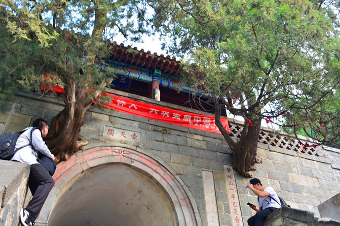 壶天阁。门洞有双柏自墙内横生,盘旋而上,堪称奇景。壶天阁位于泰山中路回马岭下,明嘉靖年间称升仙阁,乾隆十二年拓建改名壶天阁,取自道家以壶天为仙境之意,1979年重建阁楼。壶天阁跨盘道而建,为城门楼式。门洞上镶石匾额“壶天阁”,是乾隆皇帝登泰山时所题。清嘉庆年间崔映辰题联“壶天日月开灵境,盘路风云入翠微。”廷路又题联“登此山一半以是壶天,造极顶千重尚多福地。”两位仁兄坐在两边纹丝不动,等了一会儿依然如故,只得拍下这么个