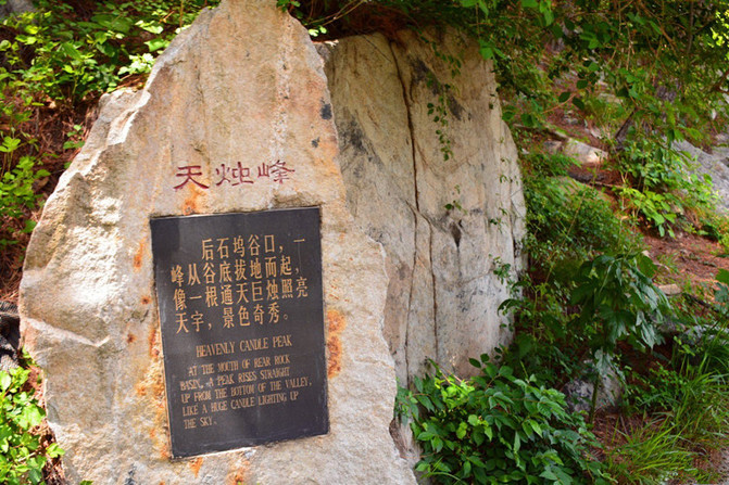 “小天烛”。小天烛峰一柱状孤峰从谷底霍然拔起,高耸似烛,峰端的劲松,宛若烛焰燃烧,因此称“烛焰松”。