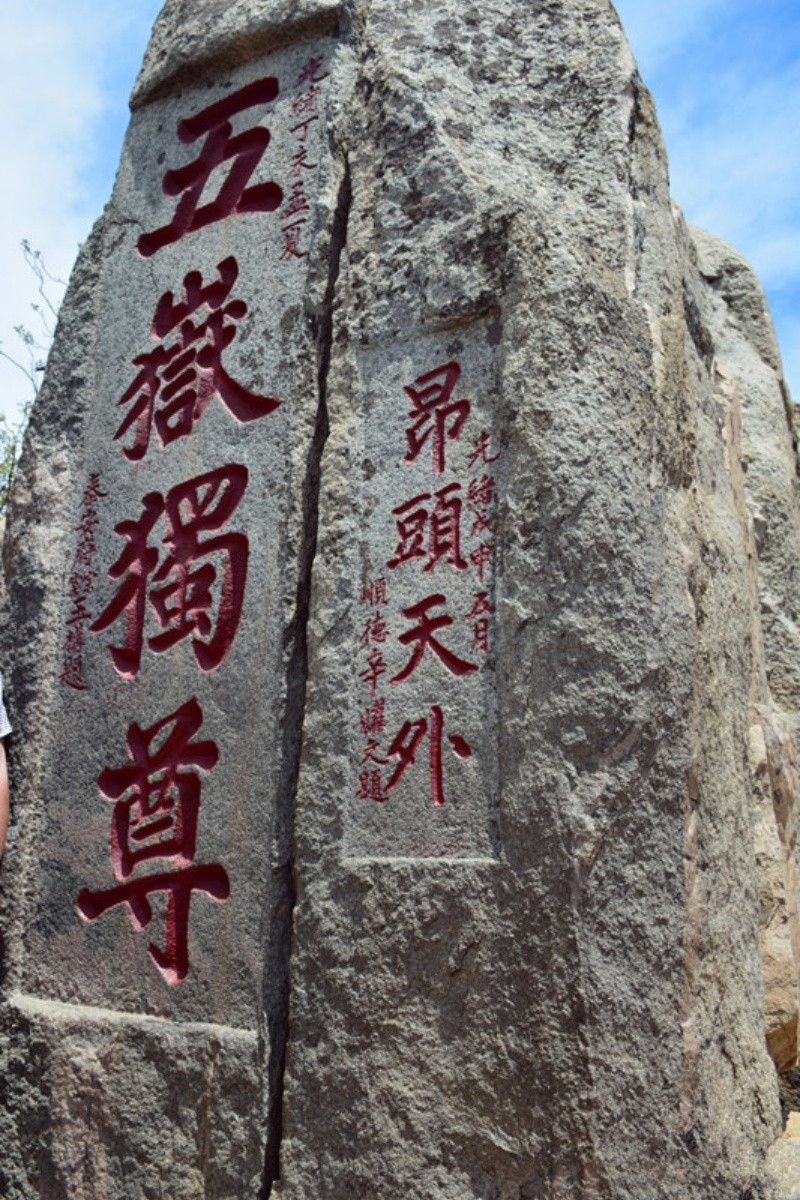 大观峰石刻。在玉皇顶盘路东侧,削崖为碑,布满了历代题勒。摩崖高13.3米,宽5.5米,全文1000字,书体为唐隶,文辞典雅,书法遒劲,颇具盛唐风格。明代文学家王世贞评价此处时说:“穹崖造天铭书,若鸾飞舞于烟云之表,为之色飞。”大观峰和云峰上遍布题刻,唐刘仁愿、宋赵明诚、元徐世隆、明朱衡、清阮元及施闰章等历代名流题刻历历在目。“置身霄汉”、“青碧丹崖”、“天日苍茫”、“呼吸宇宙”等大字与《纪泰山铭》互为辉映,令人叹为观止。其中最著名的是唐玄宗于开元十三年登封泰山时御制御书的《纪泰山铭》,俗称“唐摩崖”。