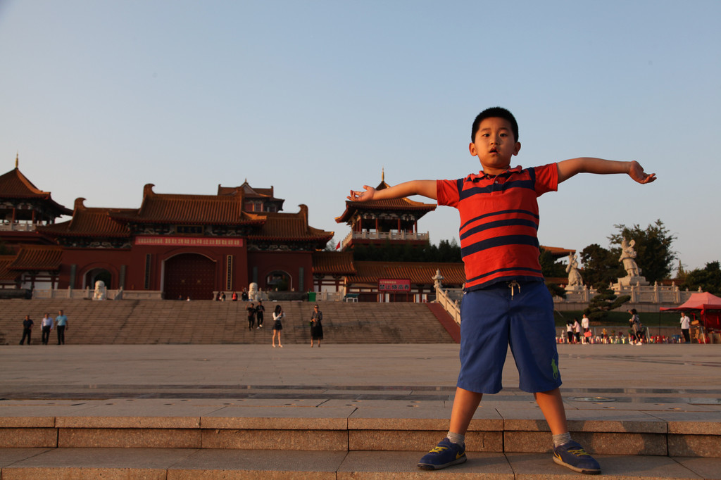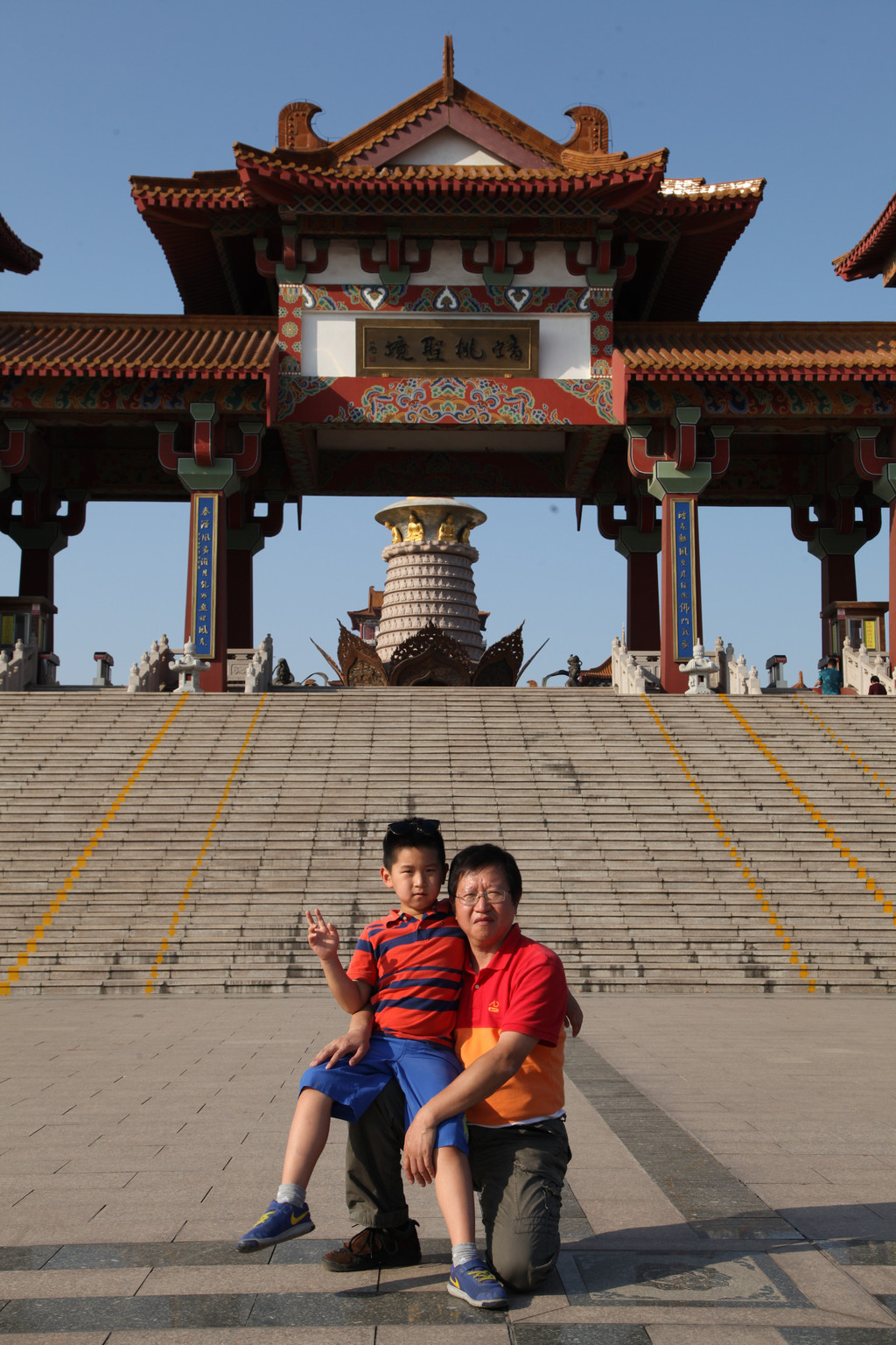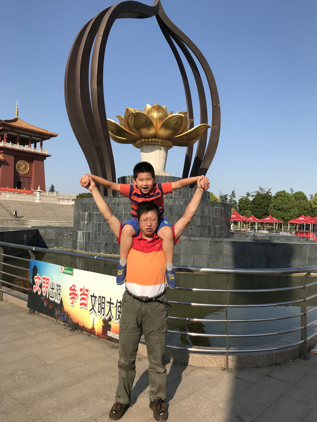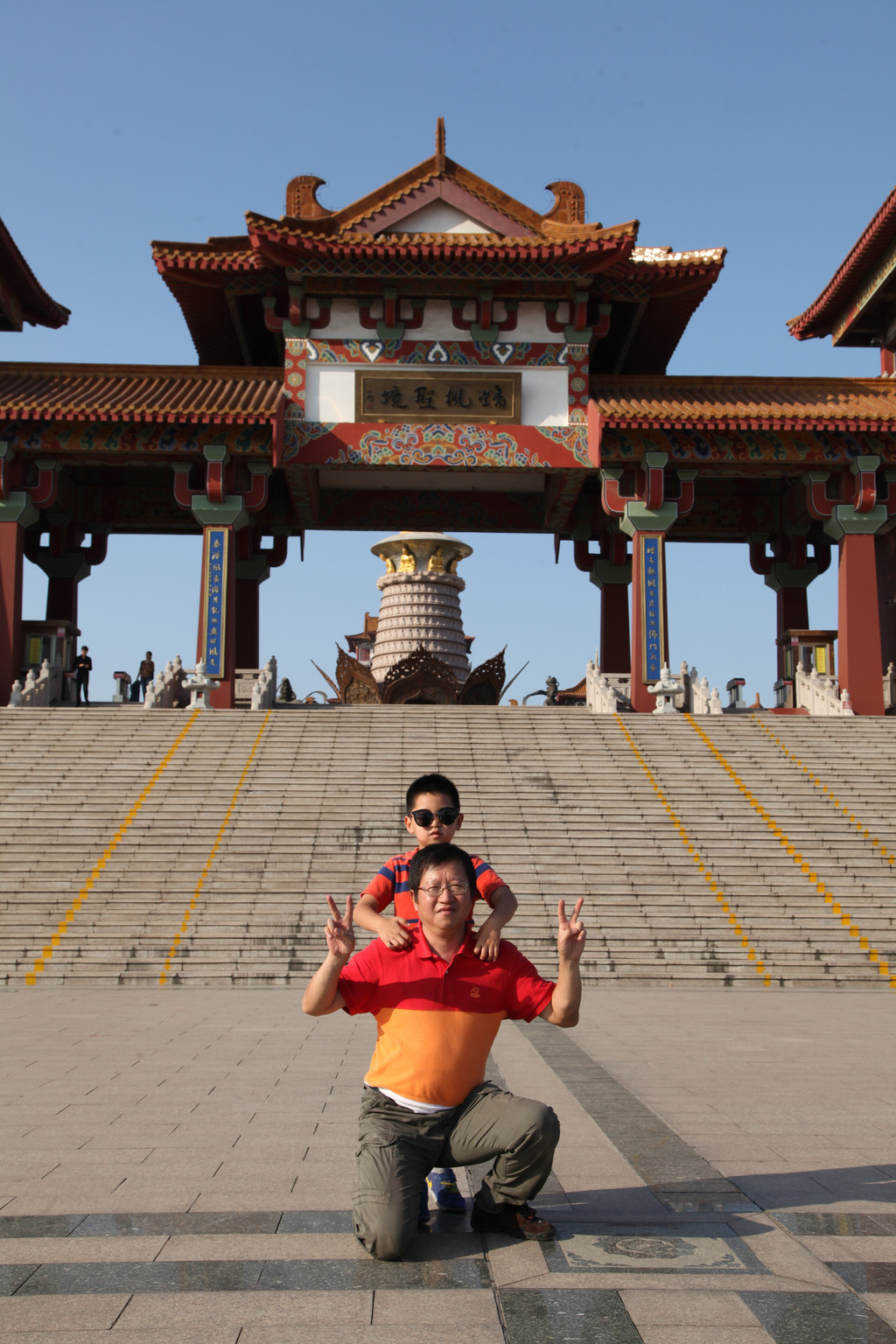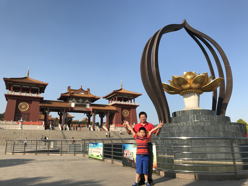 龙太子要骑在爸爸头上照相,就此留念,宝莲寺菩提圣莲广场