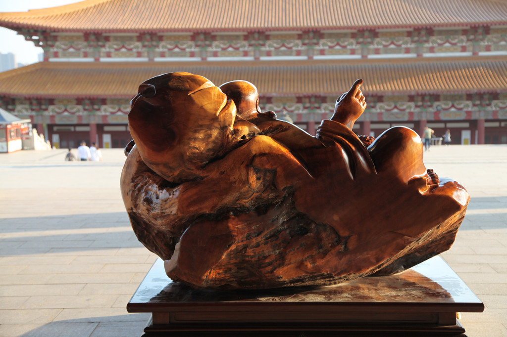 弥勒菩萨的佛指,遥手一指,通天阁前的根雕弥勒菩萨法像