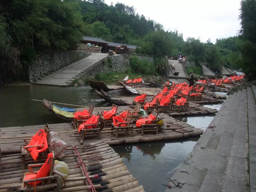 上清溪在泰宁东北部,金湖上游。景色秀丽新奇,幽静可人。最近几年开发上清溪旅游项目,竹筏游览四季可行,其中崇际至长兴15公里为深山峡谷地带,赤壁丹崖把溪流挤逼为歪歪扭扭的曲线,号称有“九十九曲、八十八滩”。两岸人迹罕至,森林茂密,方圆几十里内仍保持原始状态,形成弯多、滩急、潭深、山高、林密、峡逼的特点。虽然我见过长江三峡,游过桂林山水,但是这里的景色毫不逊色。梢公一路介绍道:古代没有陆上交通,乘坐竹排沿溪而下是山里人外出的唯一出路,山里就竹子多,竹排出山后当然无法逆水急流划回,就上集市拆散卖掉。这样偏僻的山里,居然出了不少名人居士,有状元,举人等,可想而知,当年人们考取功名多么艰难。上清溪漂流距离16.5公里,用时近3小时左右,水流平缓,但两岸风光非常秀美。下雨天漂流,则两侧崖壁上山水流下如瀑布,竹排就穿行于瀑布之间;而遇到涨水,狭窄河道水面会陡然升高,与开阔河面形成近2米的落差,行舟会格外刺激。顺筏而下,溪流蜿蜒在山峦叠嶂的赤石翠峰之间,天为山欺,水求石放,山重水复,别有天地;溪水或急流成滩,水不没膝;或凝滞成潭,深不可测,最窄处天留一线,仅容一筏通过,人过则空谷传声;两岸人迹罕至,森林茂密,方圆几十里内仍保持原始状态;常年有奇花异草盛开,暗香扑鼻,溪谷中随处可见野鸭、鸳鸯、白鹭、飞鹰翱翔山林,嬉戏水间;更绝的是,每一个景点都可以从不同的角度,不同的距离,幻化出不同的景物,不同的意境,惟妙惟肖。