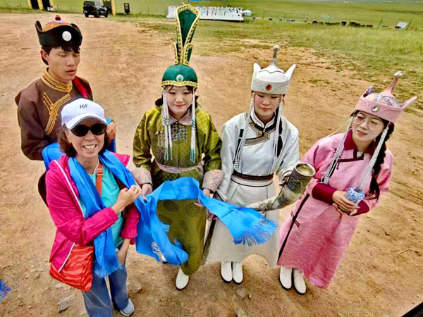 团友们进入马镇景区,在下大巴车时,受到了景区蒙古族青年男女的热情相迎,她们给每位团友献上一条蓝色的哈达和一杯马奶美酒。让大家无不感受到了蒙古族同胞们的浓浓情谊。