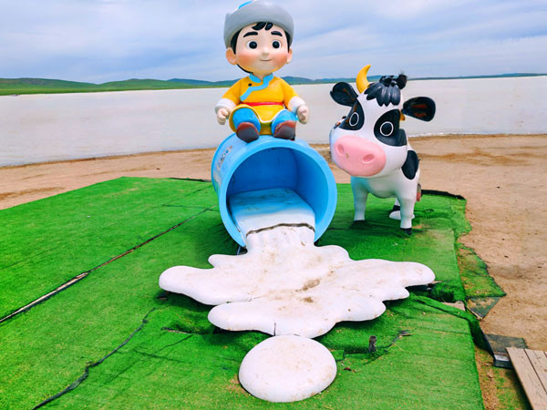 由于湖水流动或风力作用搅动湖底矿物沉积层,使微细碳酸钙颗粒悬浮于水中形成胶体状分布,对光线产生散射作用,让水体呈现均质乳白色。特别是在湖畔还有一些卡通造型的景观,给平静的湖水平添了一股生气勃勃的氛围。