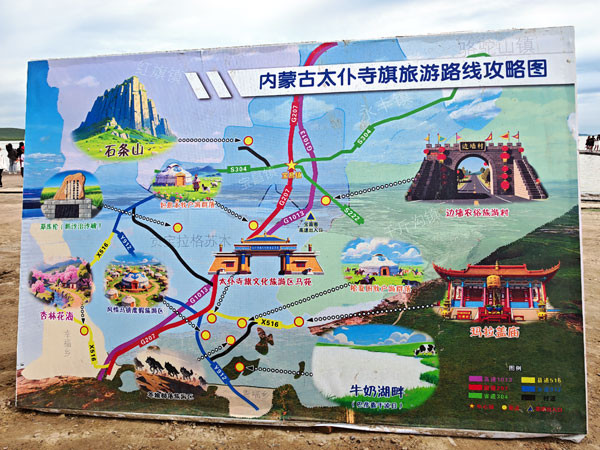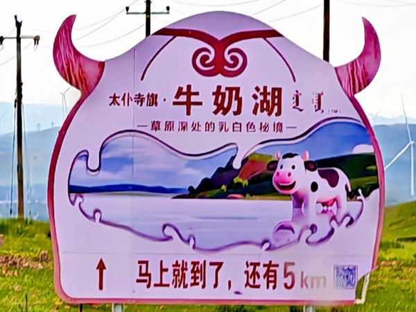 看得出来,这里的宣传很到位,在即将到达景区的途中,游人隔三岔五的就能看到距离“牛奶湖景区”多少公里的导引路牌。上面由卡通形象与景区相结合的路牌设计十分显眼,让人感到很温馨的同时,能一目了然地看清前往目的地的所在里程。