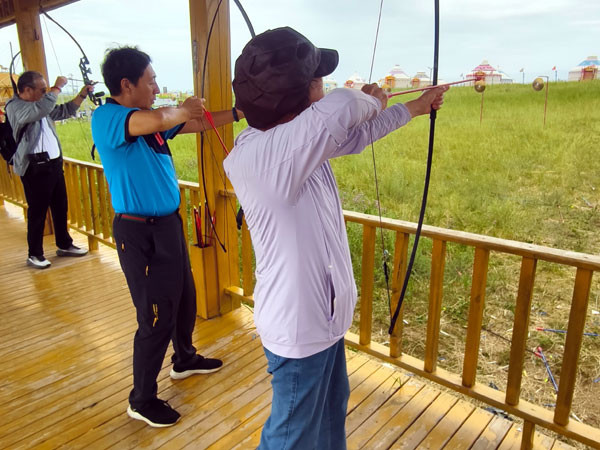 午餐后大家开始参与景区中的娱乐项目。这里有骑马、射箭、投壶、攻防战、旱地滑雪、卡丁车、真人软弹射击等活动,还有民俗歌舞表演、蒙古族服饰旅拍、下马酒、祭祀敖包等特色体验项目。