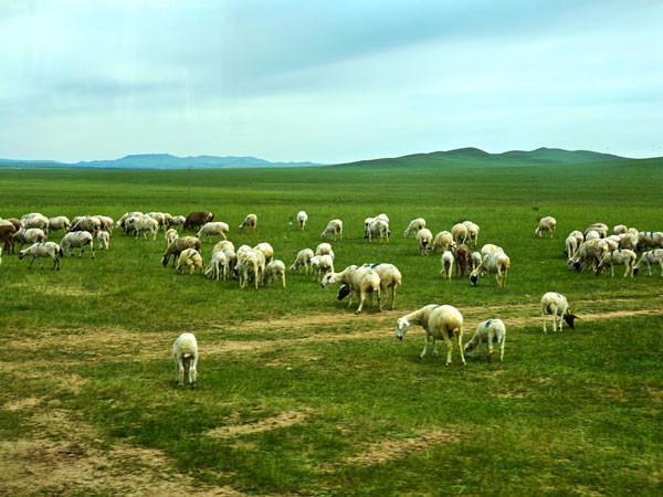 从河北向内蒙古进发的途中,人们能看到车窗外大自然景致的明显变化,从绿树丛荫的植被,逐渐过渡到辽阔无边的大草原,虽然都是以绿色为主基调的色彩,但是大草原上出现放牧的牛马羊群的景象,则鲜明地体现了内蒙古大草原的特色。