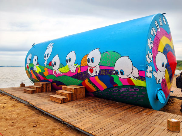 记者看到湖畔的一个五颜六色,上面画着卡通画的硕大的圆筒十分醒目,上面有着“我在太仆寺旗牛奶湖”几个字,估计这里是为游人专设的景区打卡地。
