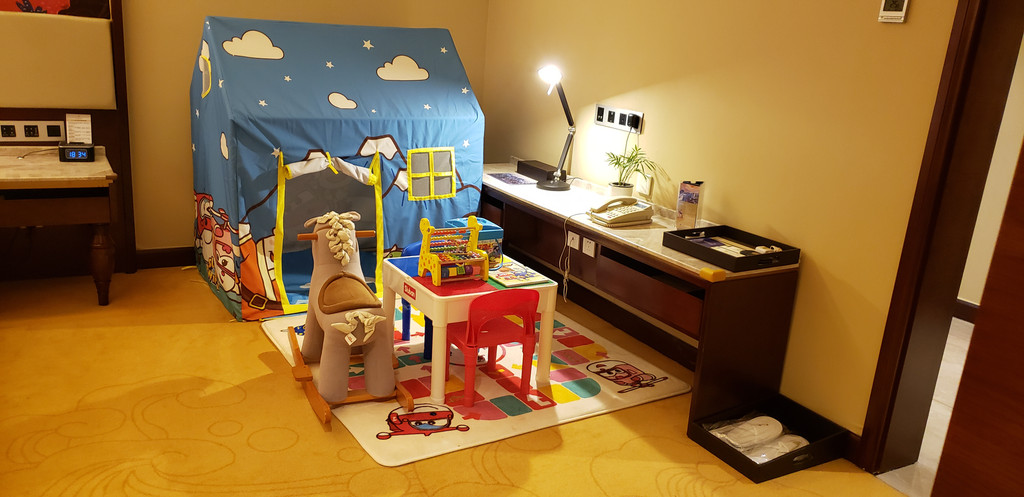在手机上的搜索了一下的泰安的酒店,综合对比了一下选择了顾客评价较高的蓝海御华大饭店,因为自己经常出差,蓝海在省内也是比较有名的,特别是服务贴别好,所以自己还是比较中意的。红门开车到酒店只有10分钟左右,非常近,于是在携程下单预定了订单,考虑到带着孩子,定了一间家庭房。下单没多久就收到了酒店美女的电话,询问我几人入住、对房间有什么特殊求。。。。得知我爬山,主动提出给我准备泡脚盆,并且免费升级山景房,让我十分感动。到达酒店后,酒店停车场的非常大,有地上和地下,因为周末的缘故,用餐的很多,我们把车停到了负二,坐电梯直接到达大堂。酒店的服务人员热情相迎,得知我们我们是办理入住,把我们引领到前台,一报名字,前台小帅哥就查到了我们的订单,快速的为我们办理了入住,有位小美女直接把我们引领到电梯。到达房间后看到为我们准备的泡脚盆,还有药包,水果,房间内儿童玩具、小帐篷、儿童拖鞋、儿童牙刷,我家小宝高兴的不得了。简短的休息了一下,我们决定去吃自助餐,到了自助餐,人不是一般的多,都在排队,可见有火爆。我们没有等待,直接去了酒店零点厅,我们一家三口点了泰山炒鸡、泰山三美、海鲜蒸锅还有一个青菜,菜品味道不错,一共花了110多,性价比还是挺高的。吃完晚餐在大堂转了转,居然还有超市,里面卖的物品挺多的,水果、零食、泰山特产、纪念品等等,价格也不贵,比景区便宜多了,小宝还选了几个挂件带了回去。