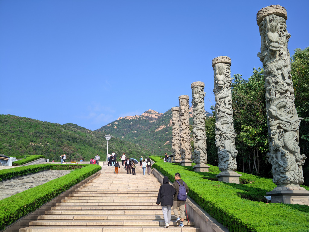拾级而上,天外村广场有12根石龙柱,分别代表我国历史上从秦始皇到乾隆皇帝,曾有12位皇帝登临泰山进行封禅祭祀。这12位皇帝分别是:黄帝、大舜、周成王、秦始皇、西汉武帝、东汉光武帝、隋文帝、唐高宗、唐玄宗、宋真宗、清康熙和清乾隆。12个石柱分左右2列布置,每列各6根。每根石柱形状都有差异,对应12位皇帝的故事,有时间可以对照网上说明细细鉴赏。