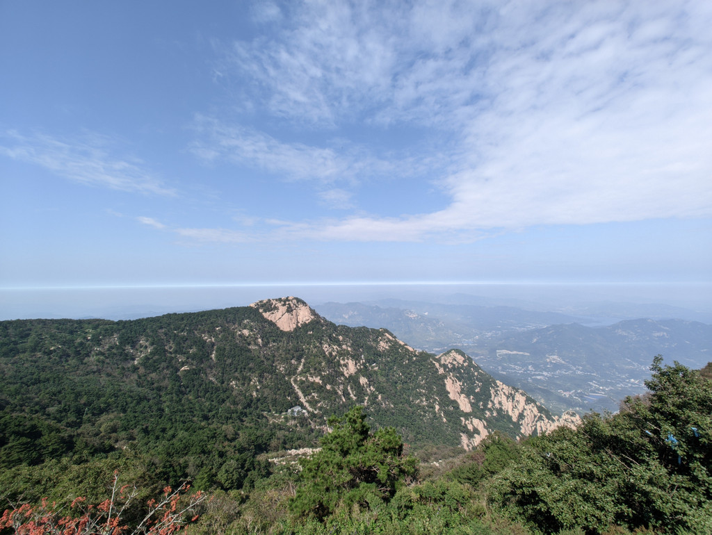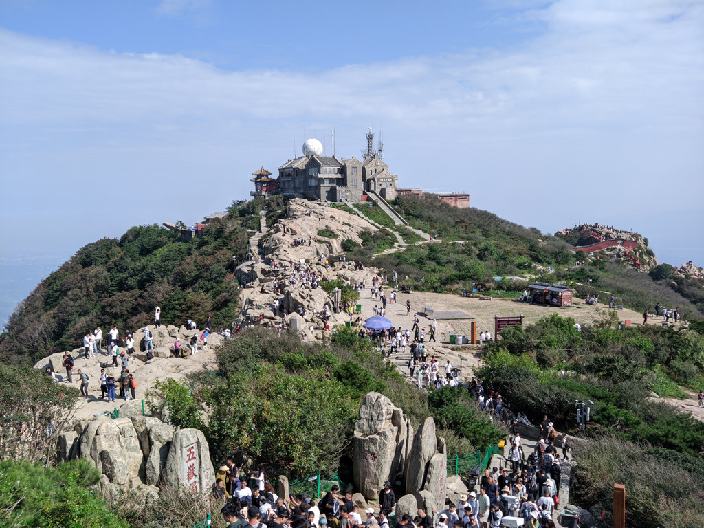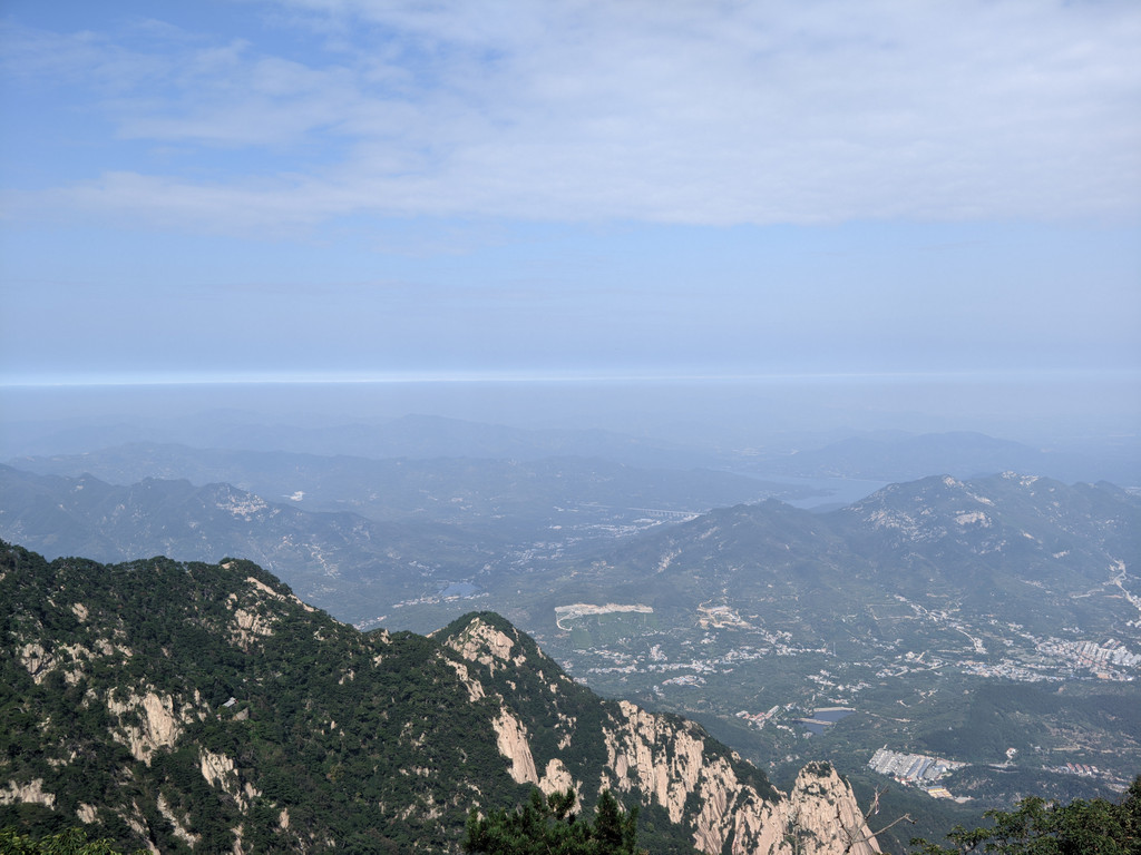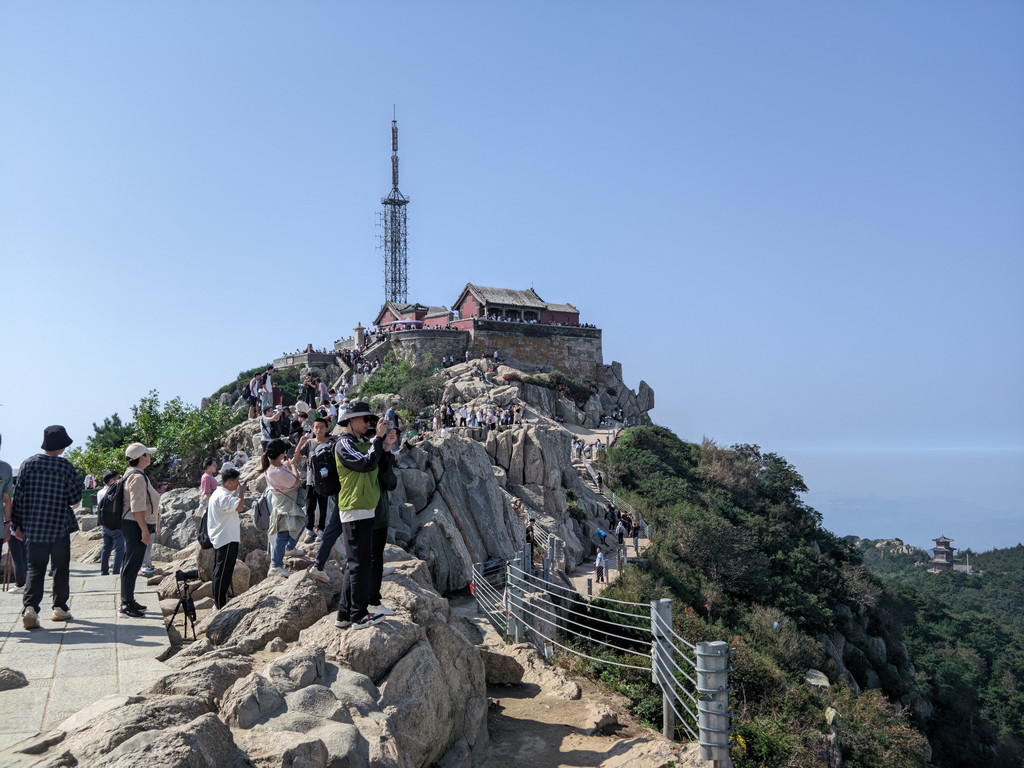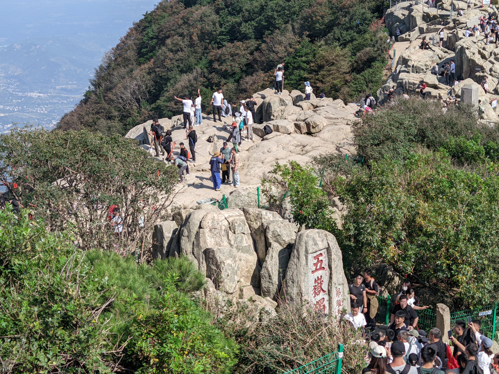 五岳独尊石碑旁边的日观峰一带视野最好,游人散落,是最佳摆拍地方。当天,还有泰山的天际线景观,泰安的蓝天白云和济南的阴霾之间形成分割线,实属奇观。