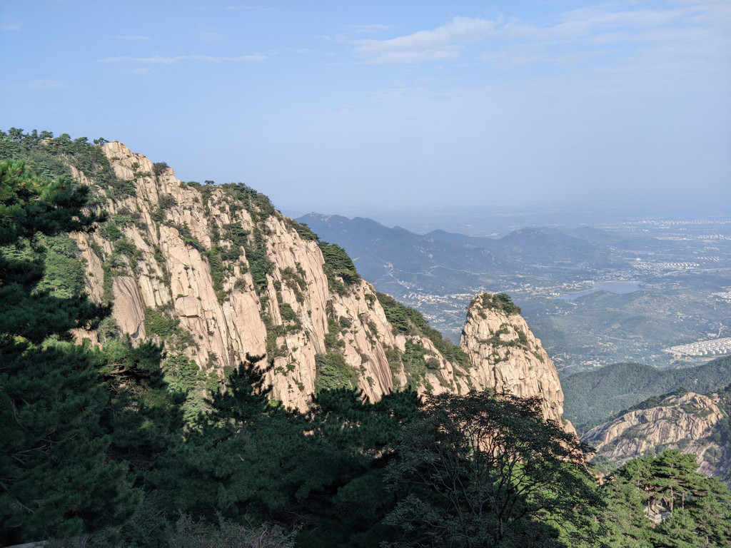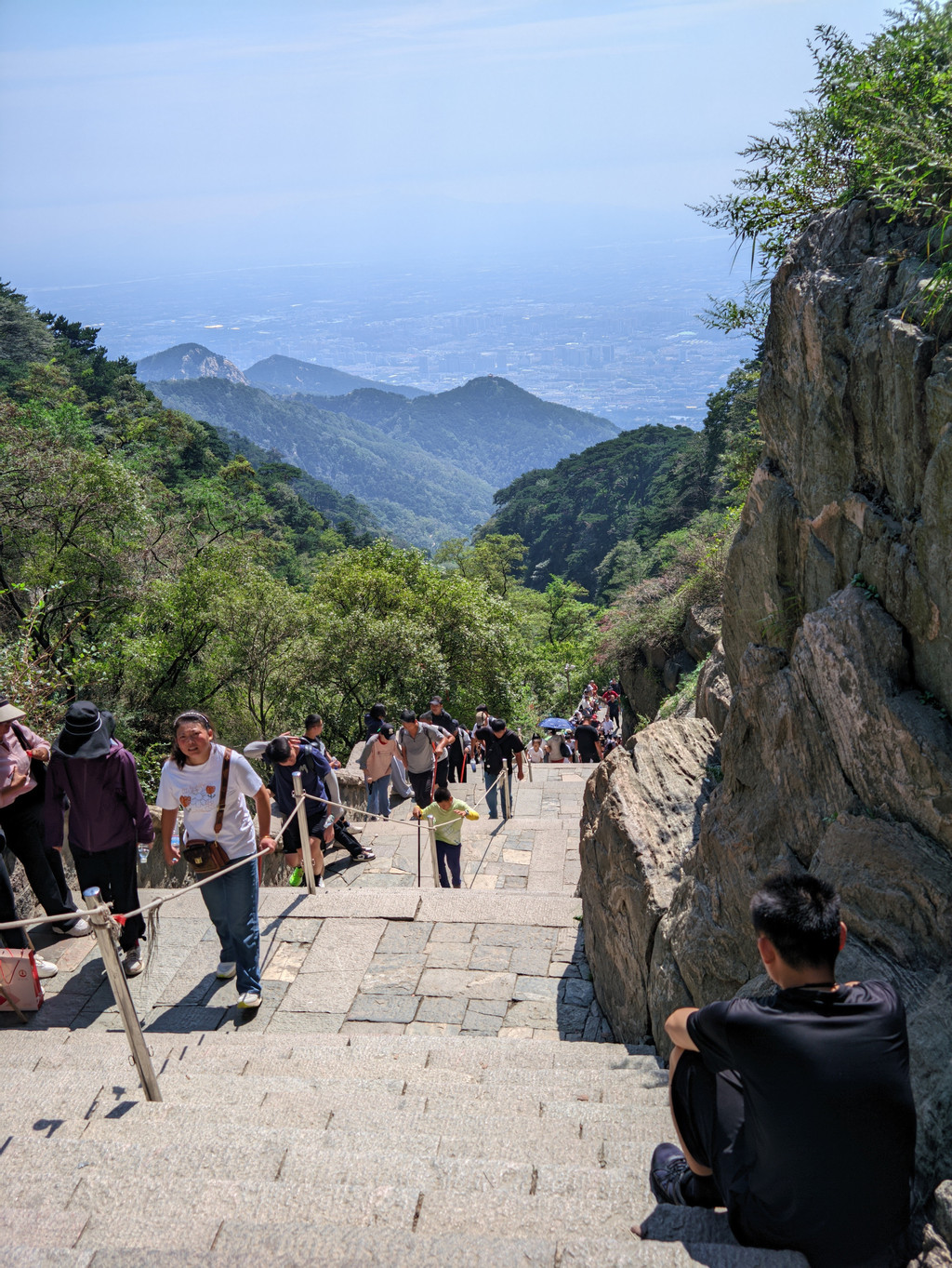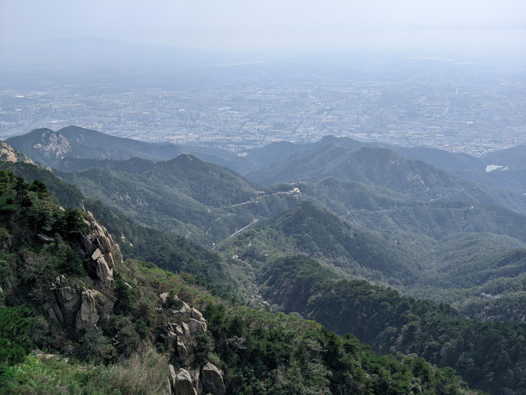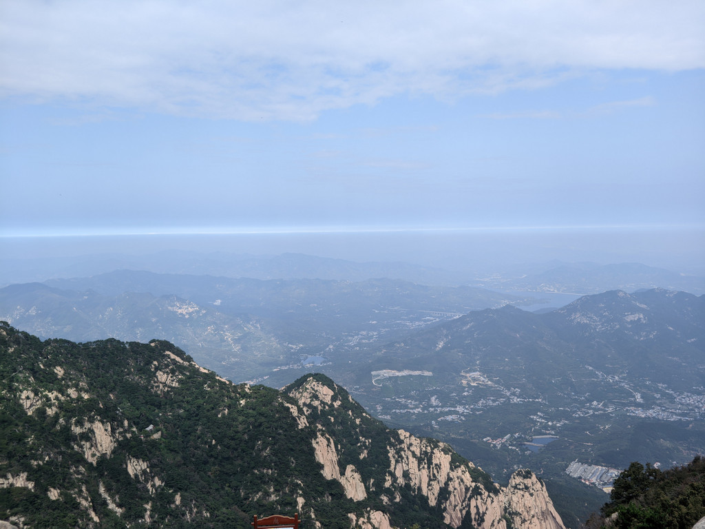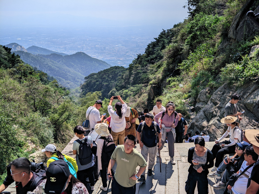 五岳独尊石碑旁边的日观峰一带视野最好,游人散落,是最佳摆拍地方。当天,还有泰山的天际线景观,泰安的蓝天白云和济南的阴霾之间形成分割线,实属奇观。