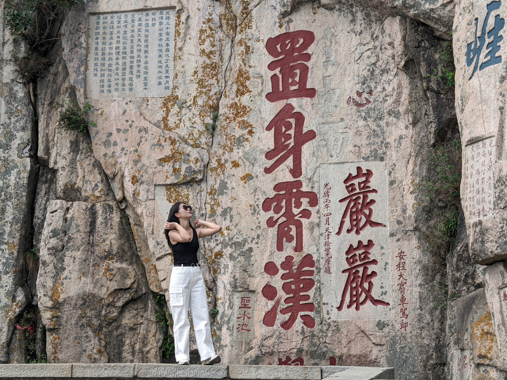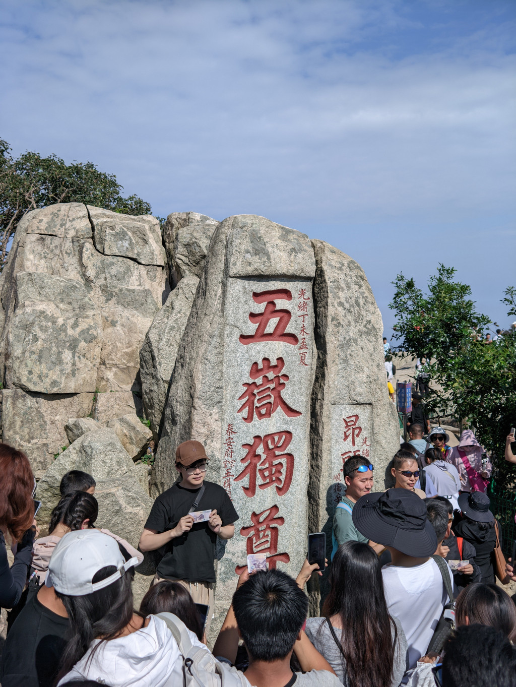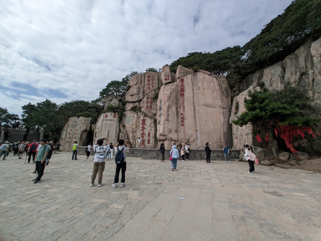 终于来到五岳独尊石刻,这是印在人民币上的泰山标志,很多人会带着人民币打卡五岳独尊石刻。五岳独尊石碑前人很多,排队吵架的也有,想拍个照不容易。